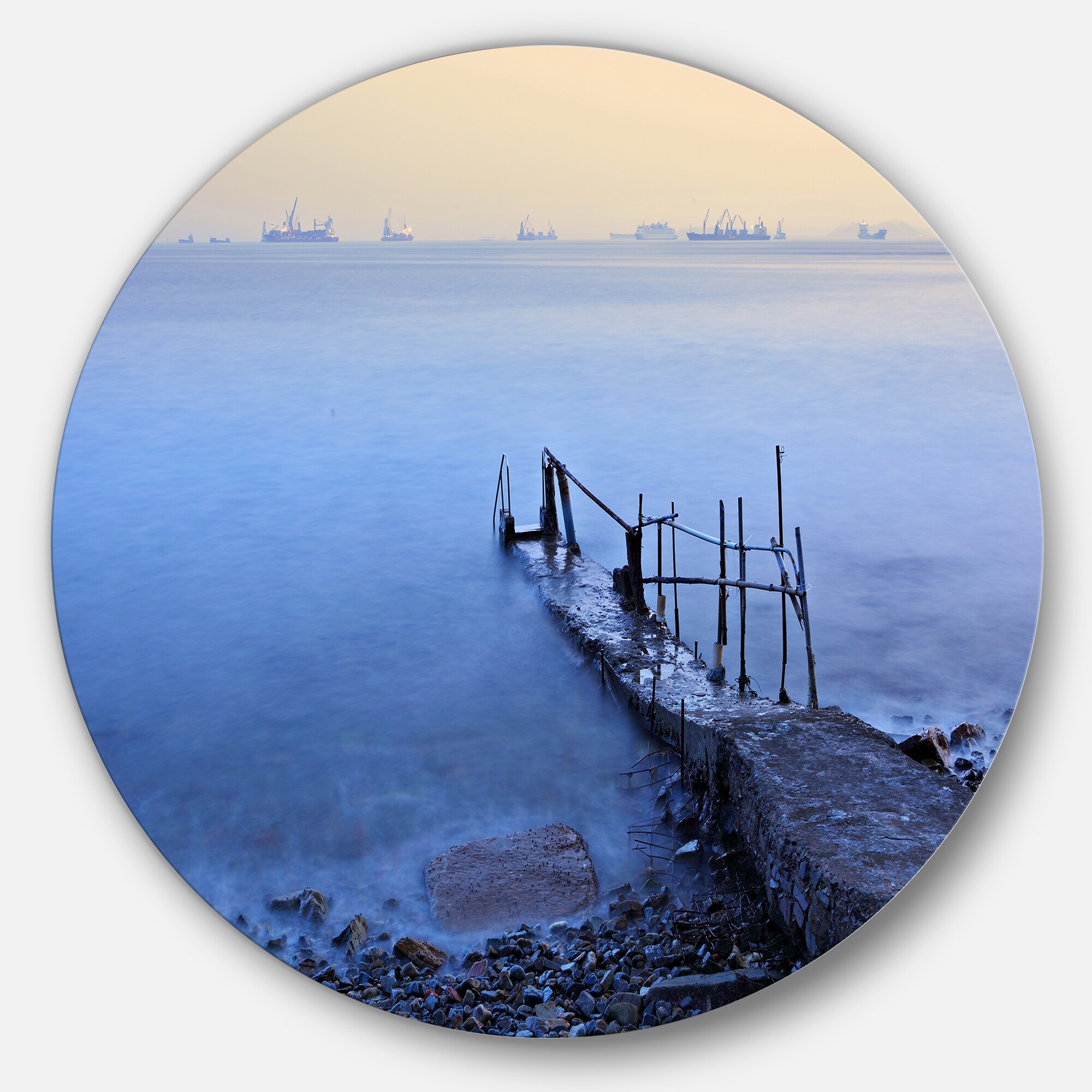 Designart 'Abandoned Pier into Blue Sea' Sea Bridge Disc Metal Wall Art