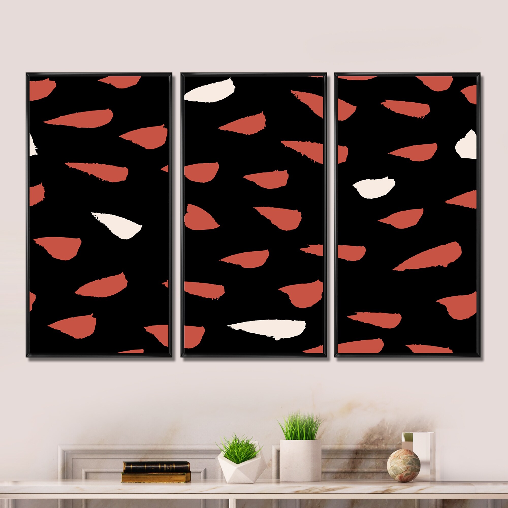 Designart "Retro Cream And Brick Red Triangles on Black I" Modern Framed Art Set of 3 - 4 Colors of Frames
