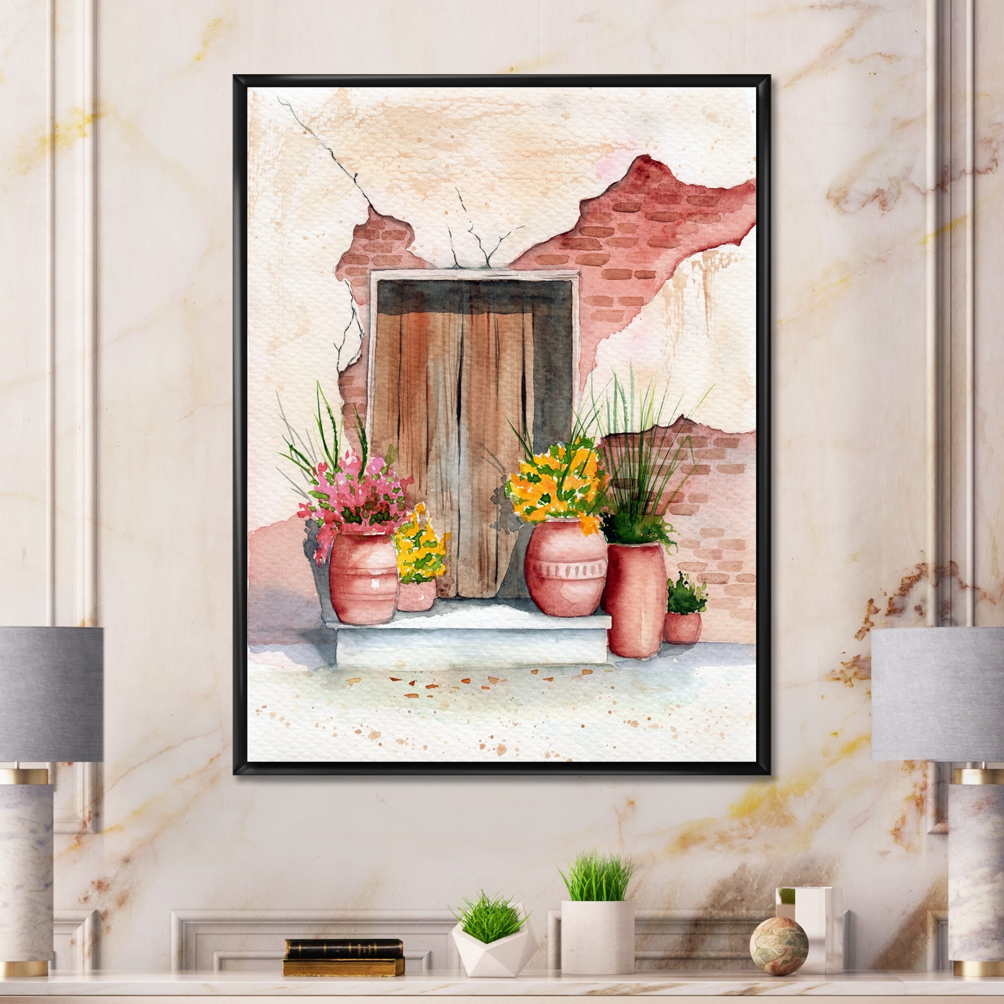 Designart "Old Wooden Door Brick Wall And Some Plants I" Vintage Framed Canvas Wall Art Print