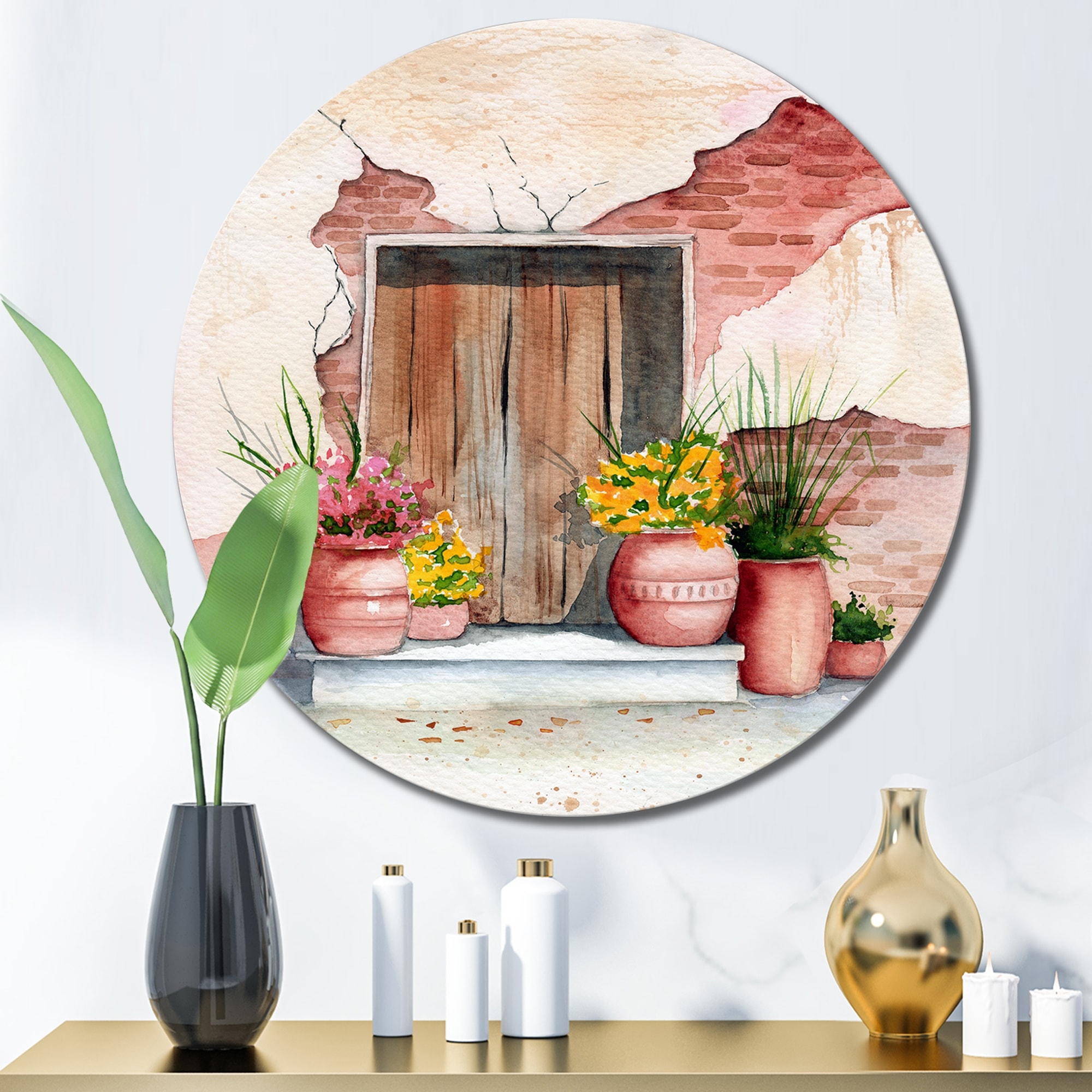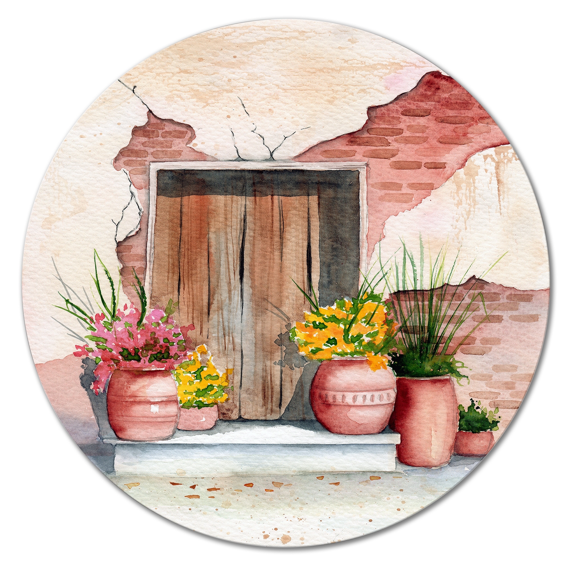 Designart 'Old Wooden Door Brick Wall And Some Plants I' Vintage Metal Circle Wall Art