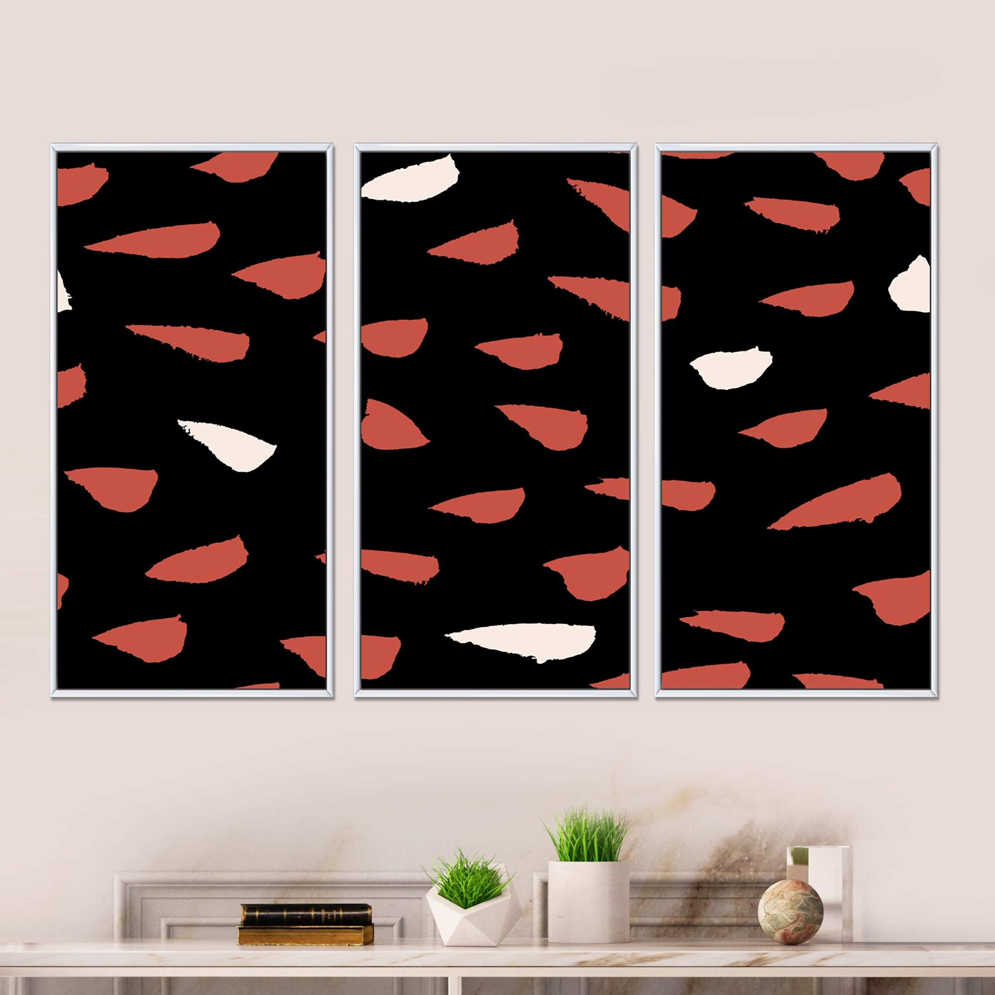 Designart "Retro Cream And Brick Red Triangles on Black II" Modern Framed Wall Decor Set of 3 - 4 Colors of Frames