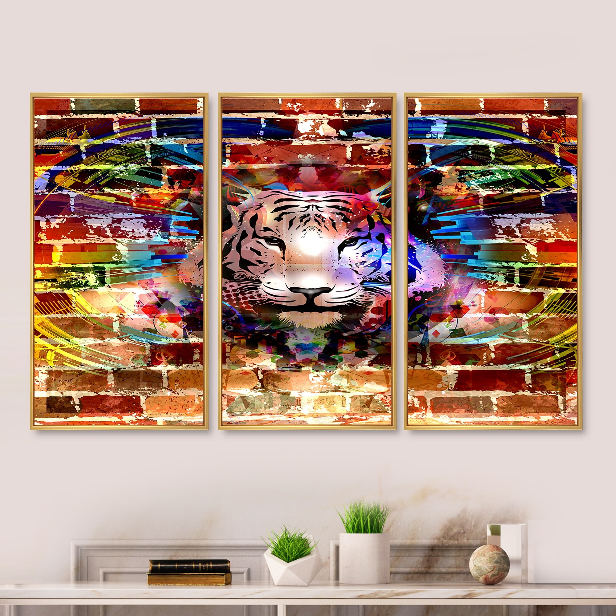 Designart "Tiger over Abstract Brick Design" Abstract Framed Artwork Set of 3 - 4 Colors of Frames