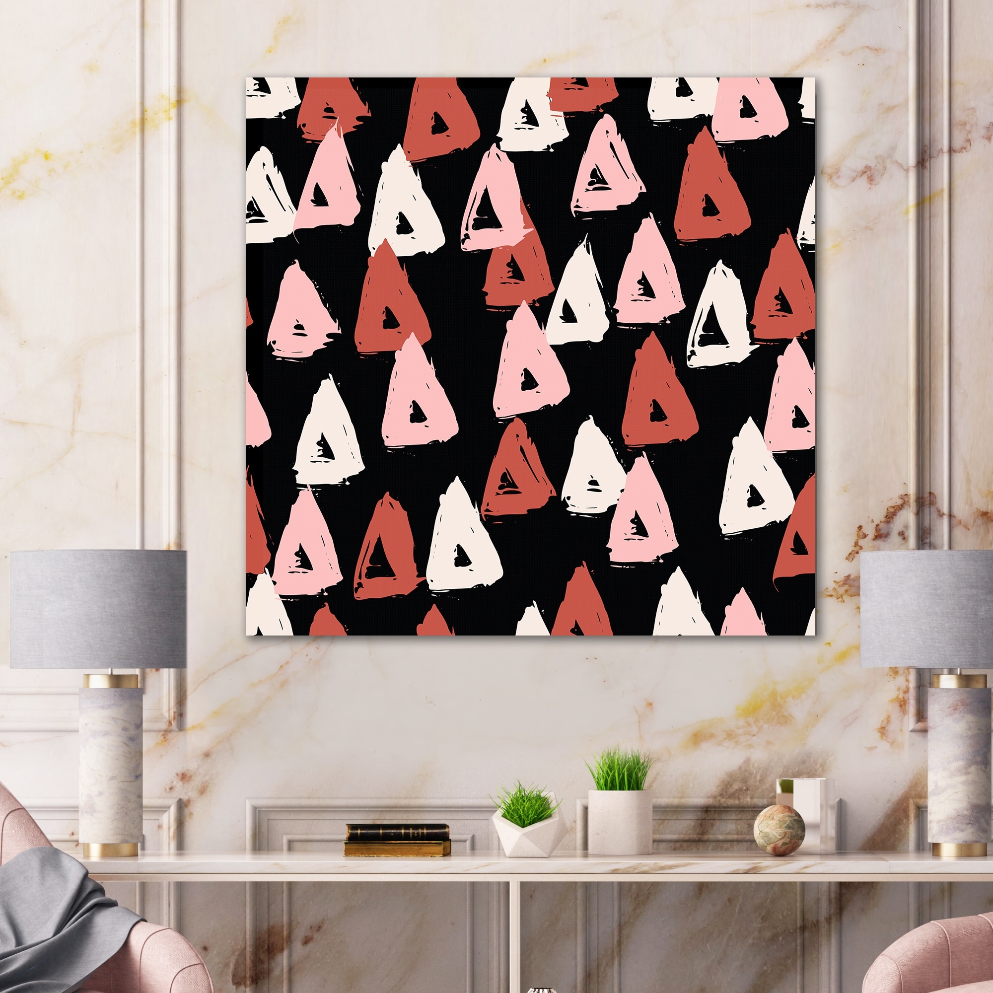 Designart "Retro Cream And Brick Red Triangles on Black II" Modern Canvas Wall Art Print