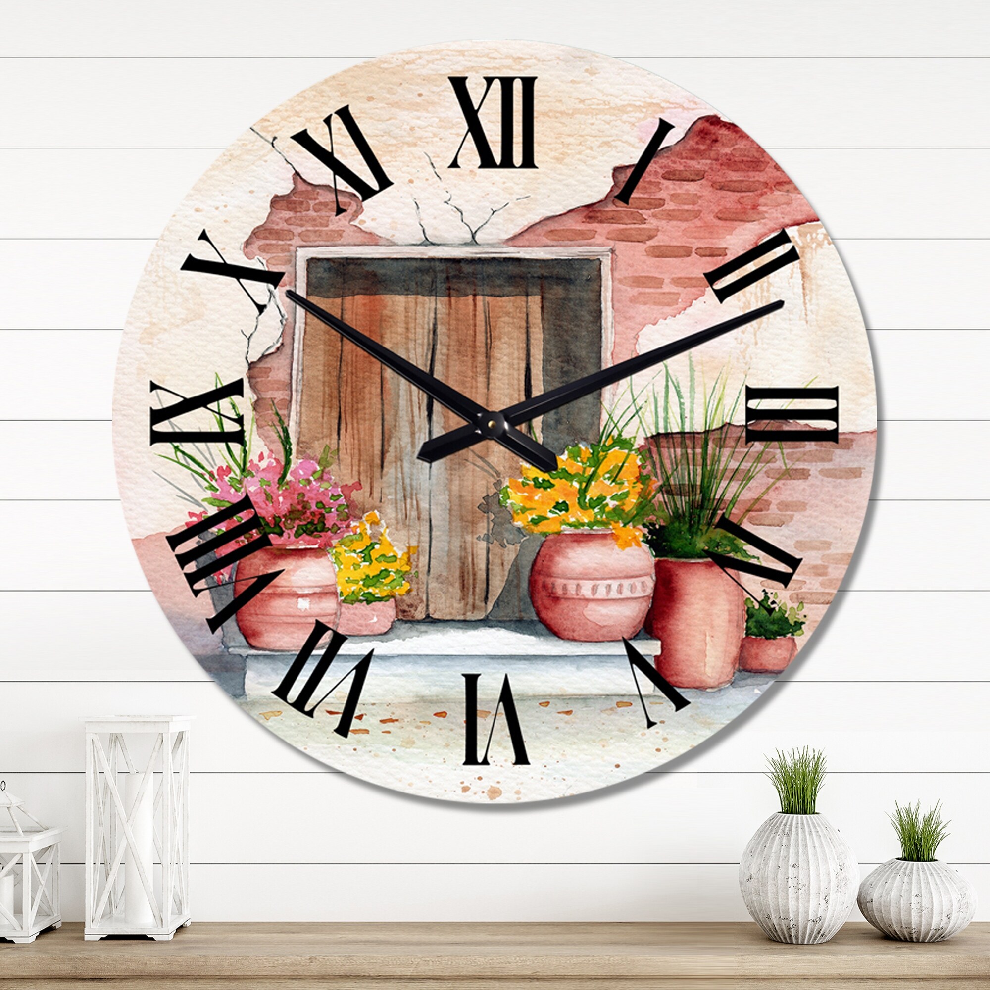 Designart 'Old Wooden Door Brick Wall And Some Plants I' Vintage wall clock