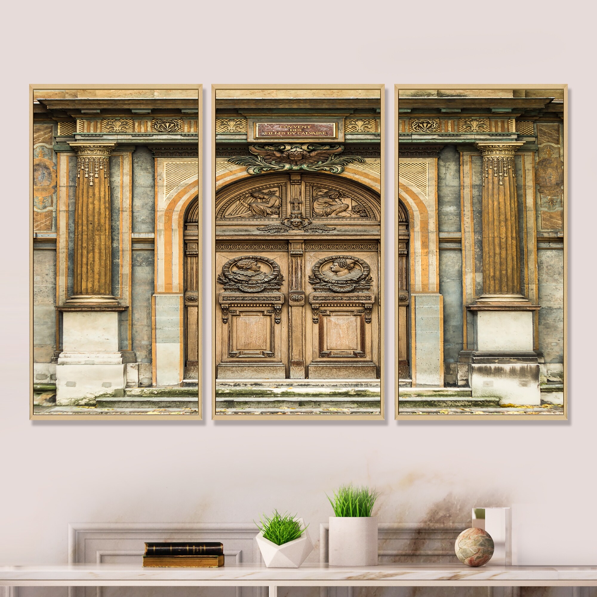 Designart "Old Wooden Door With Carvings in Paris, France" Traditional Framed Art Prints Set of 3 - 4 Colors of Frames