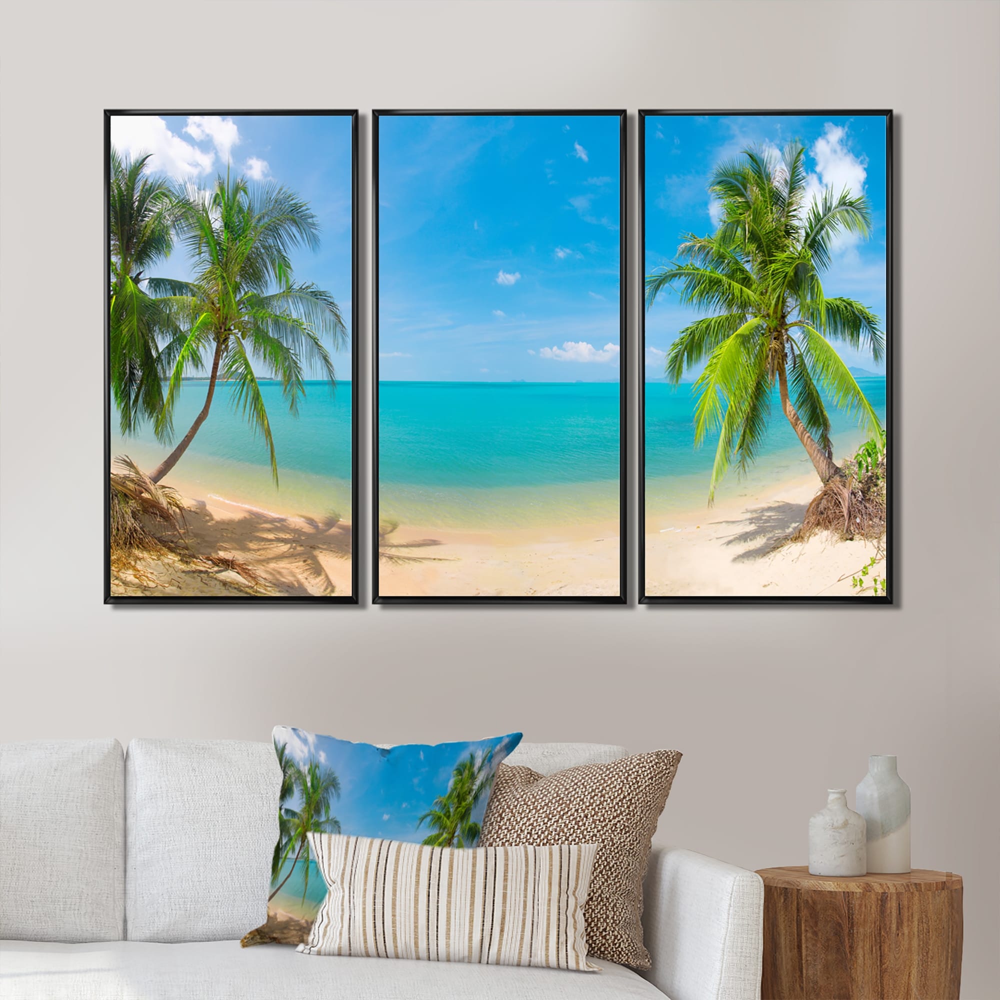 Designart "Beach with Coconut Palm Trees" Landscape Framed Wall Decor Set of 3 - 4 Colors of Frames