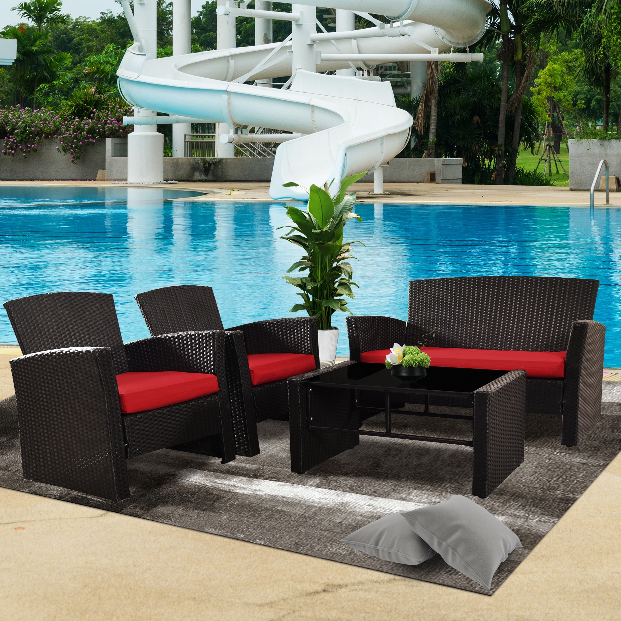 Gymax 4PCS Outdoor Conversation Set Patio PE Rattan Set w/ Glass Table