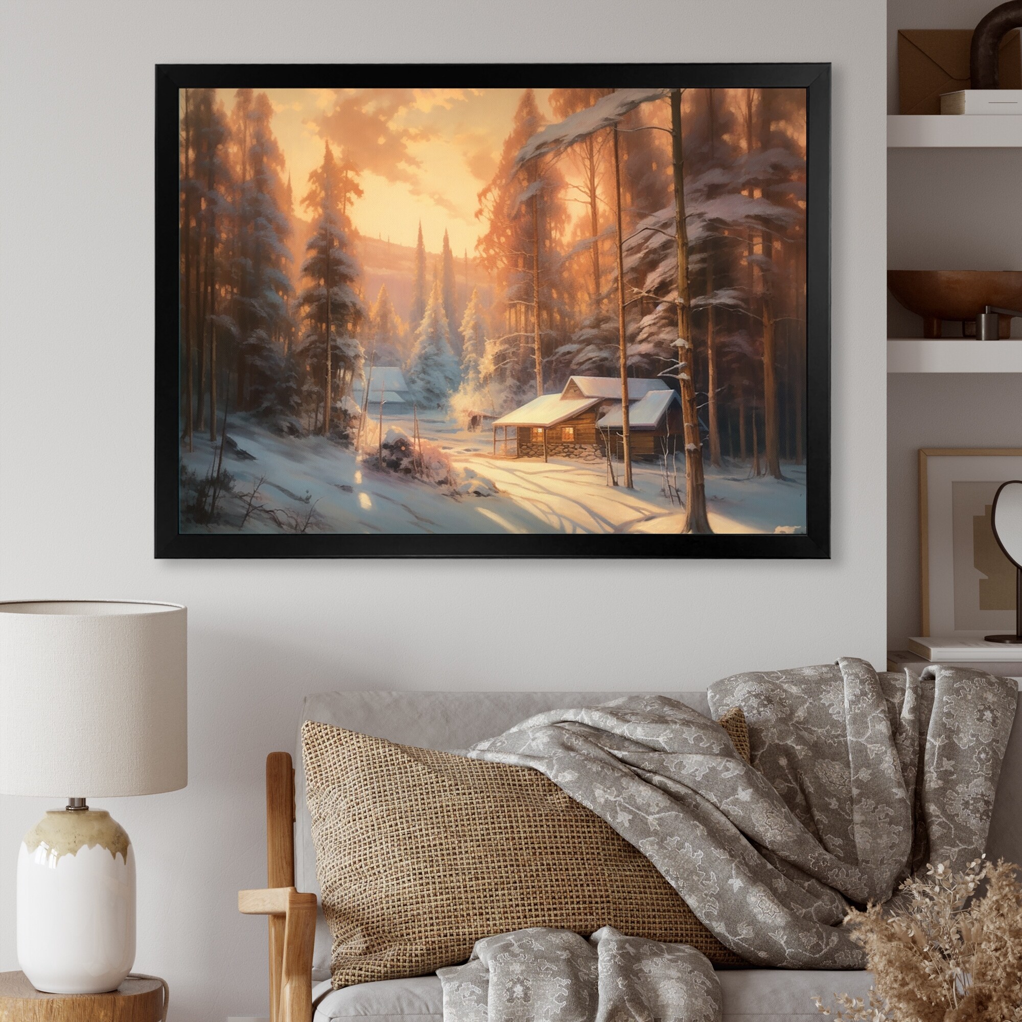 Designart "Snow Covered Cottage in the Mountains" Cottage Landscape Framed Wall Decor