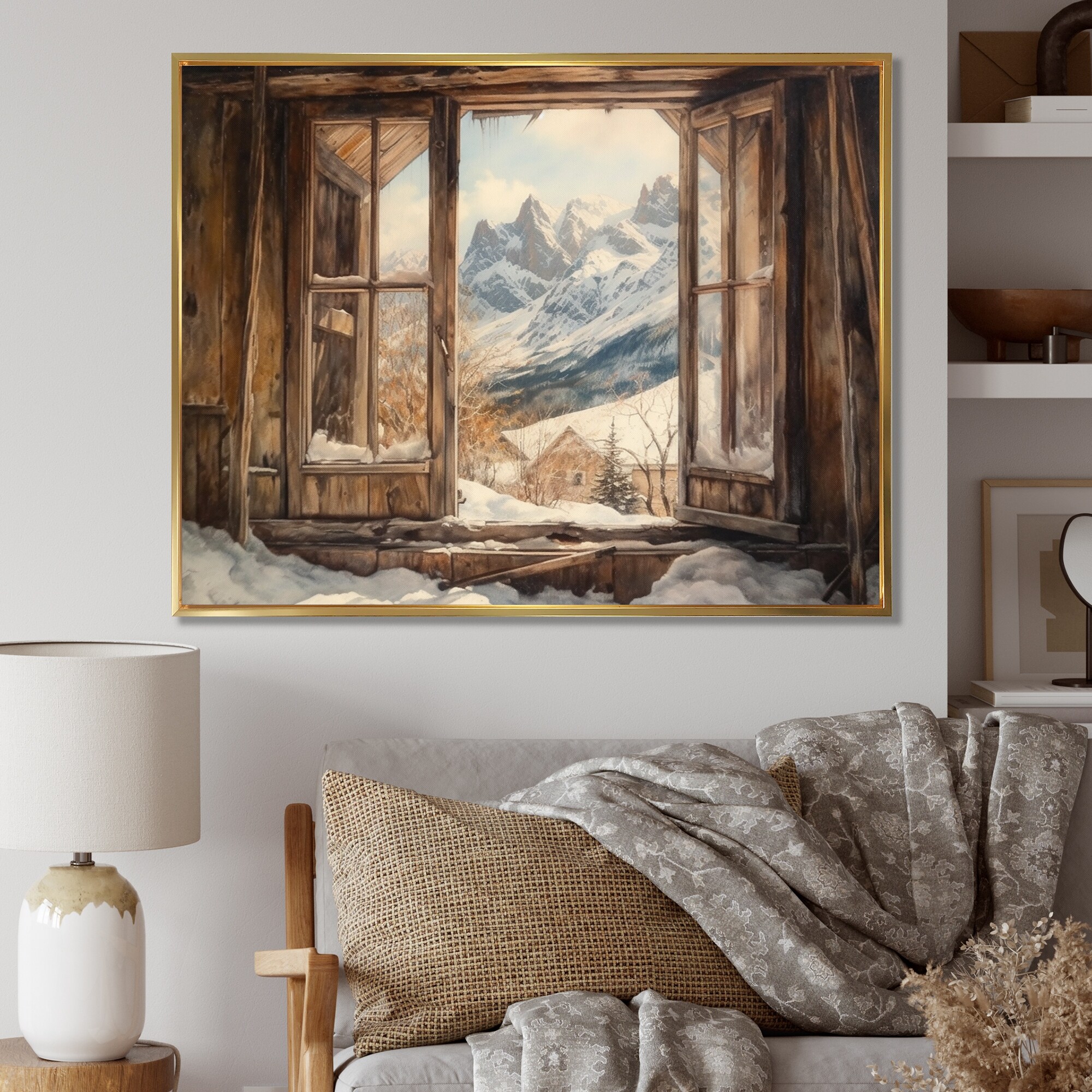 Designart "Cottage Window View of Snowy Mountains" Cottage Landscape Framed Wall Art Prints