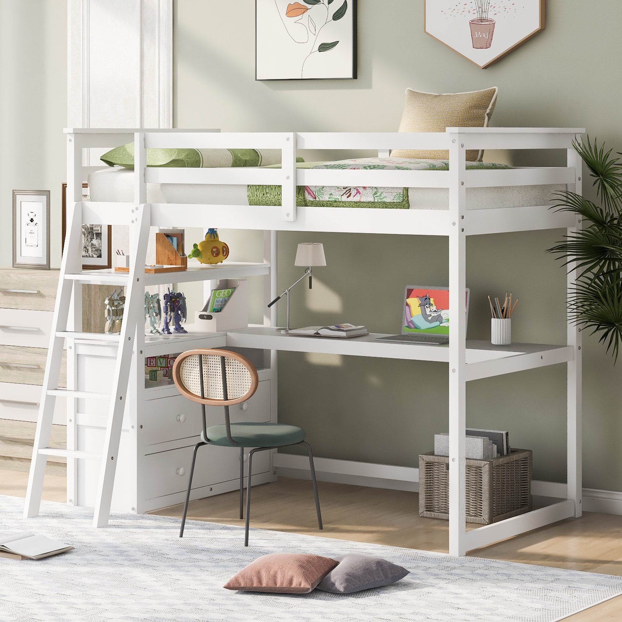 Full size Loft Bed with Drawers and Desk, Wooden Loft Bed with Shelves - White
