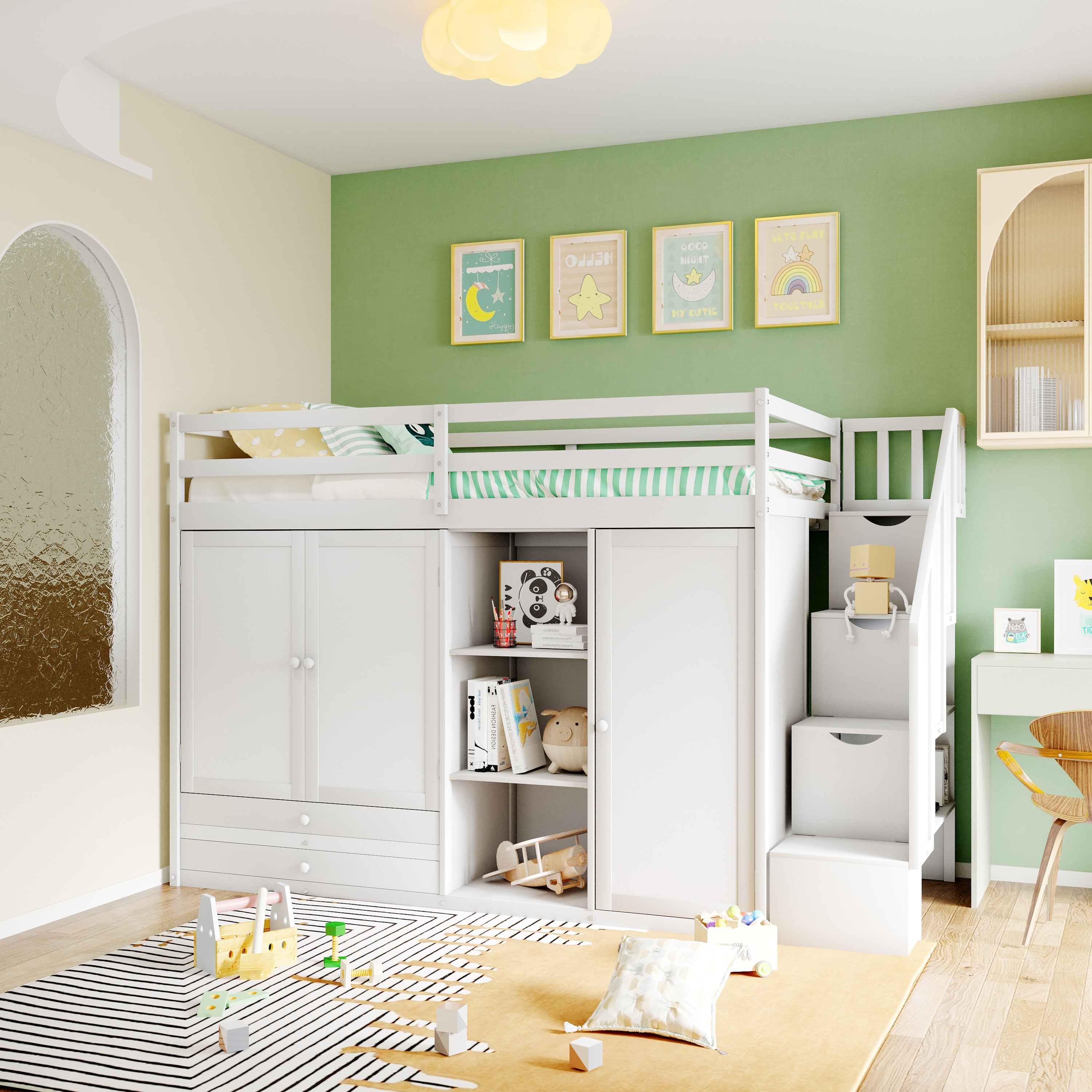 Twin Size Functional Loft Bed with 2 Wardrobes, 2 Drawers, 3 Shelves and Storage Staircase, Solid Wood Bed Frame with Guardrail