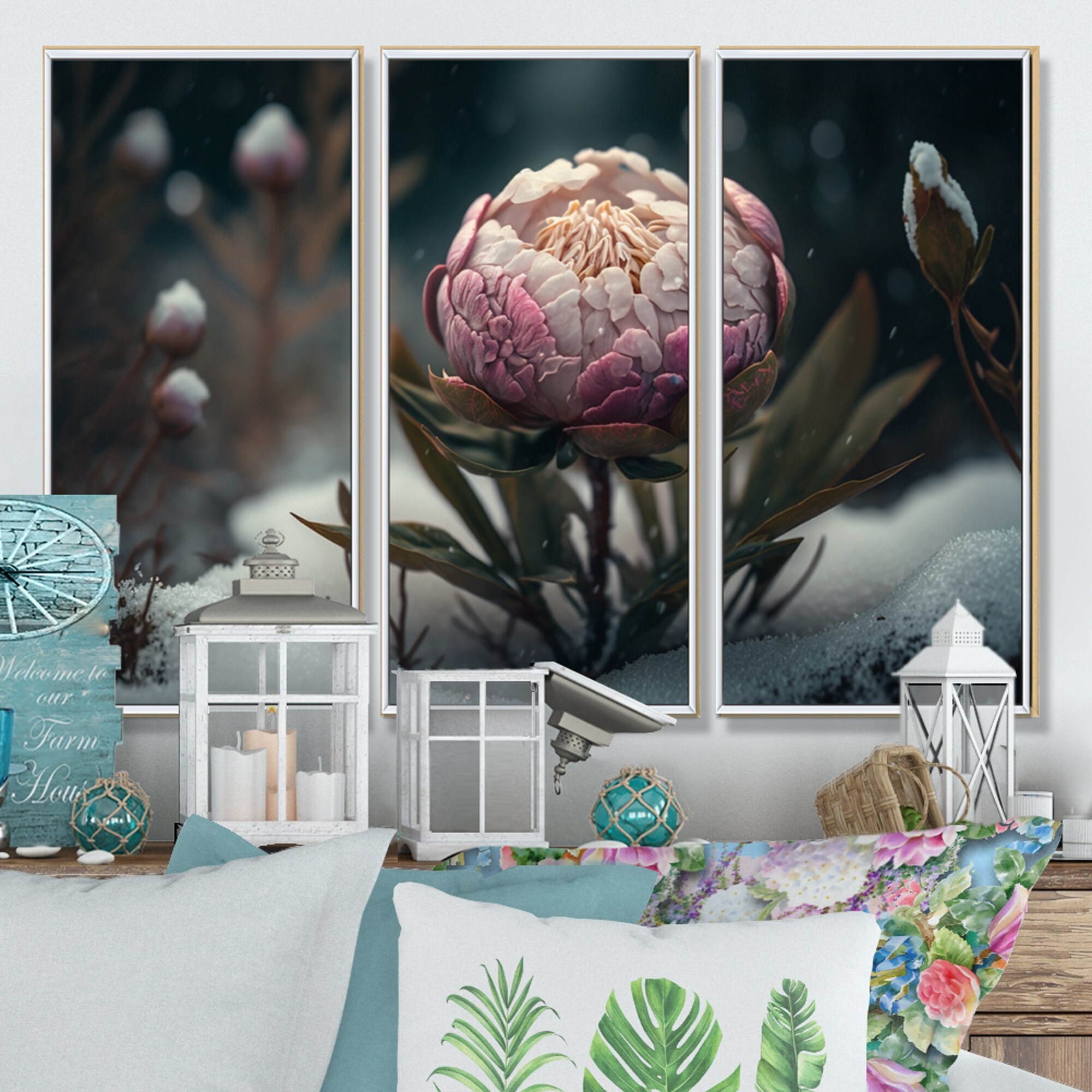 Designart "A Blooming Puple Peony Flower in Winter IV" Floral Dahlia Framed Canvas Art Print - 3 Panels