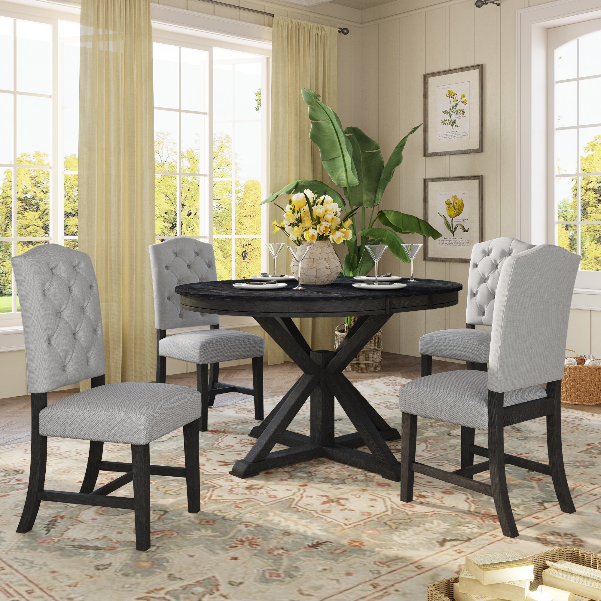 5-Piece Dining Set Extendable Round Table and 4 Upholstered Chairs Farmhouse Dining Set for Kitchen, Dining Room