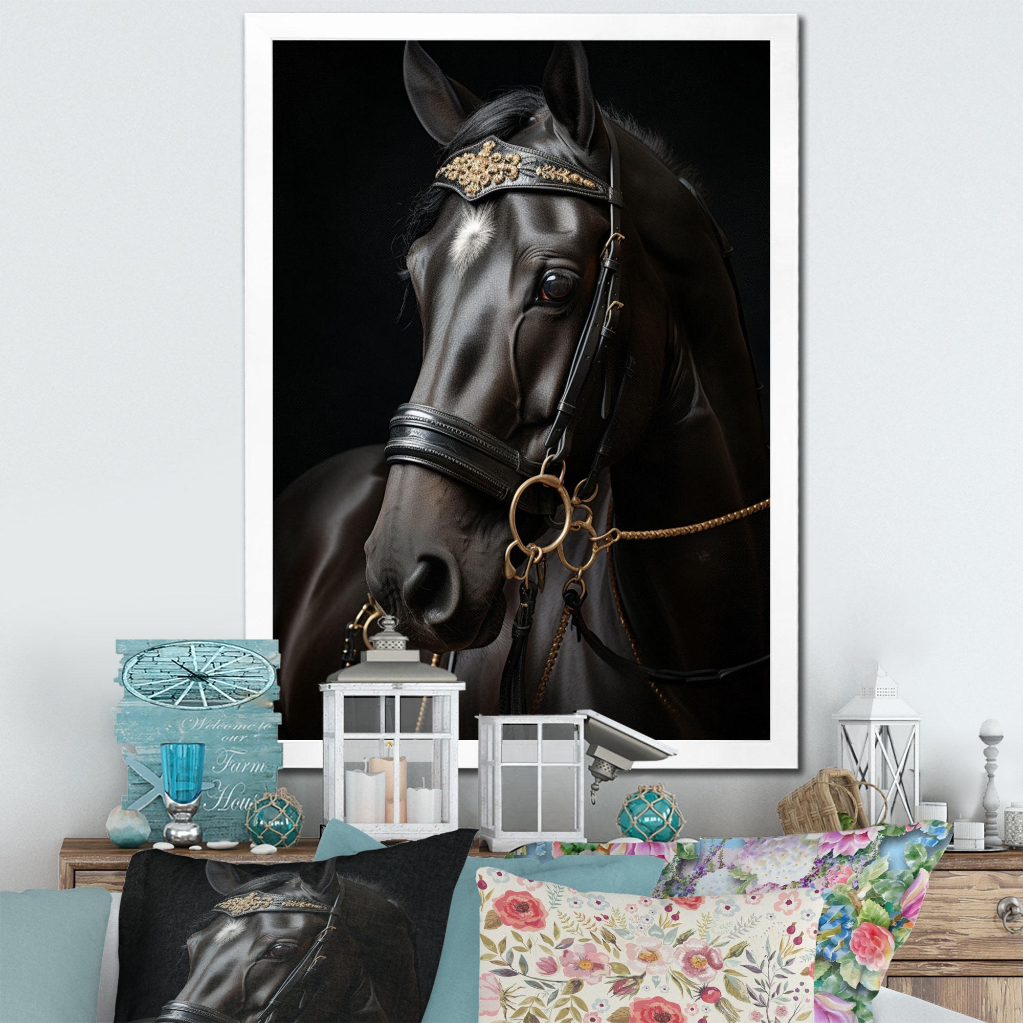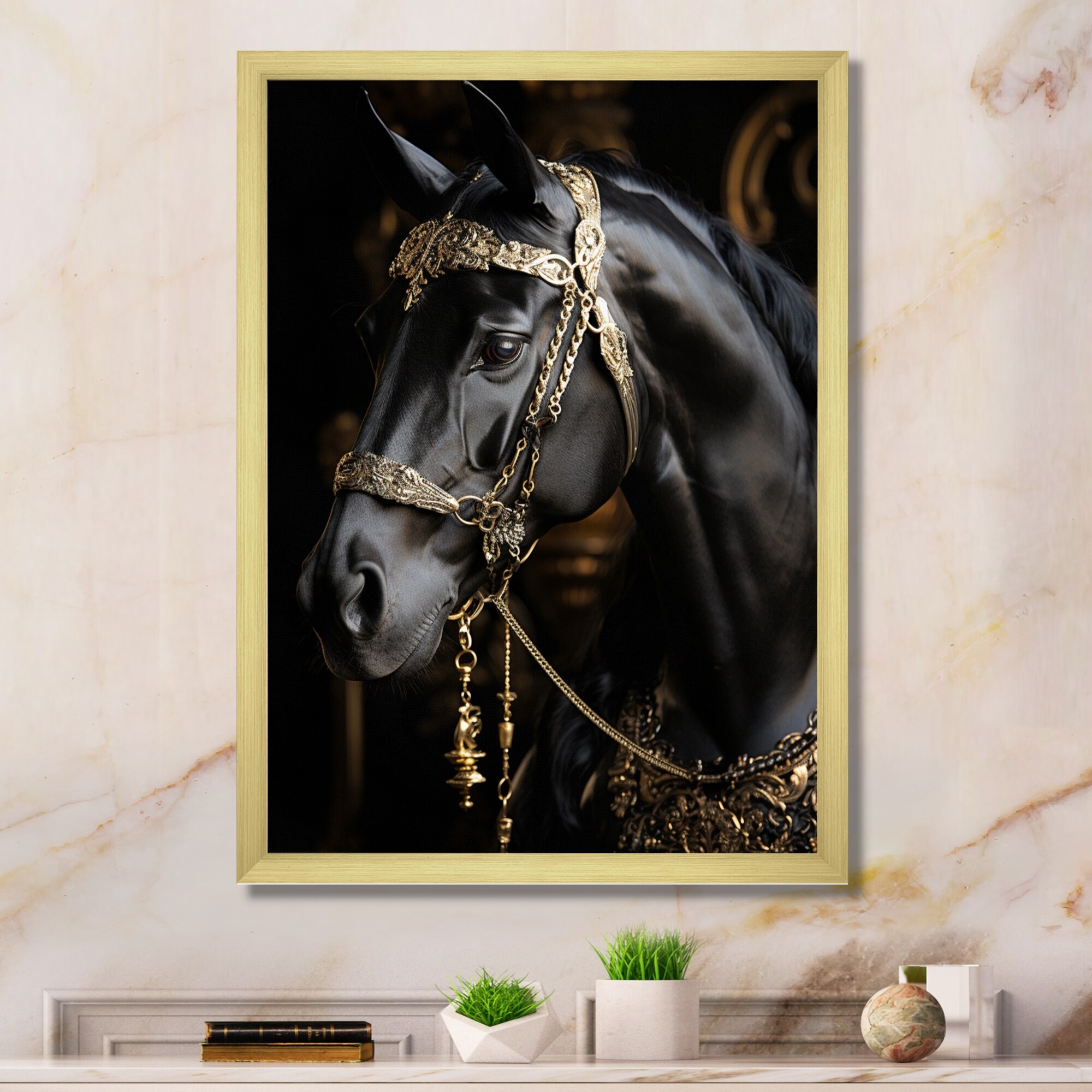 Designart "Black Gold Horse Golden Equestrian II" Animals Horse Framed Wall Art Prints