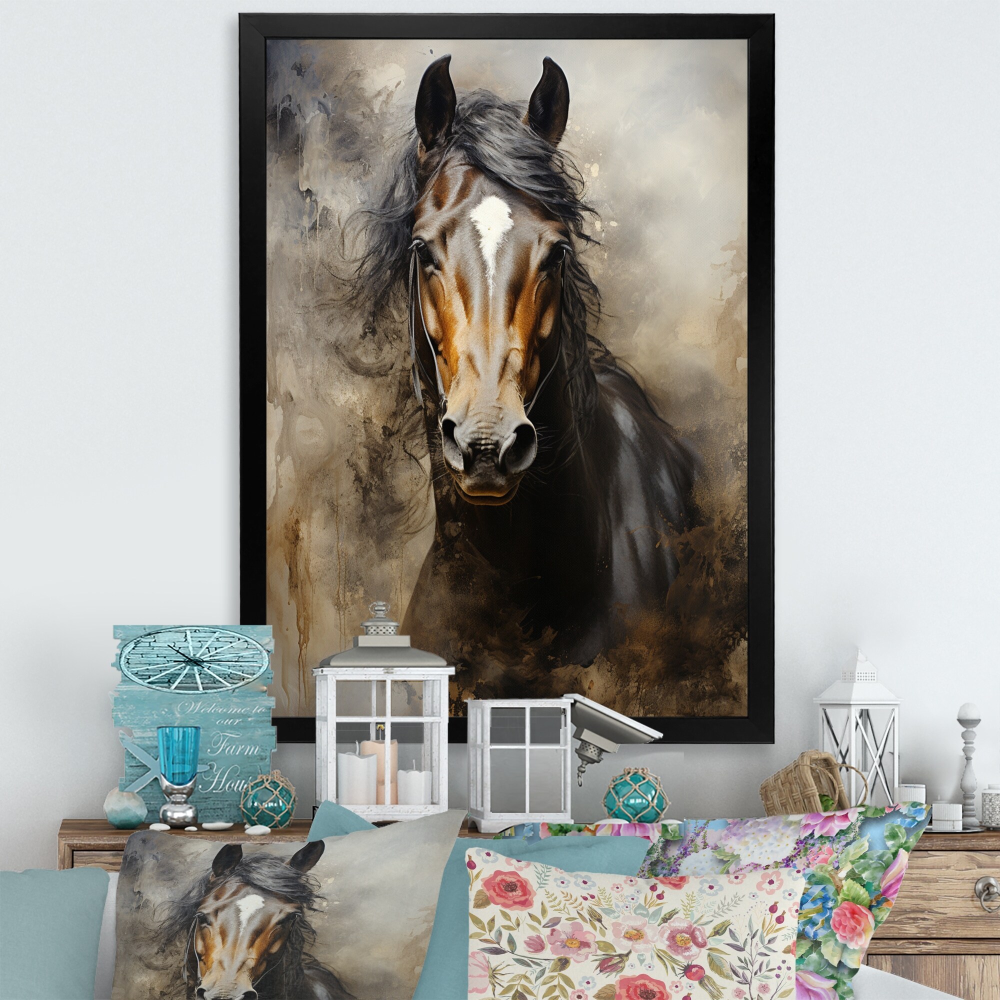 Designart "Black Gold Horse Golden Equestrian I" Animals Horse Framed Wall Art Living Room