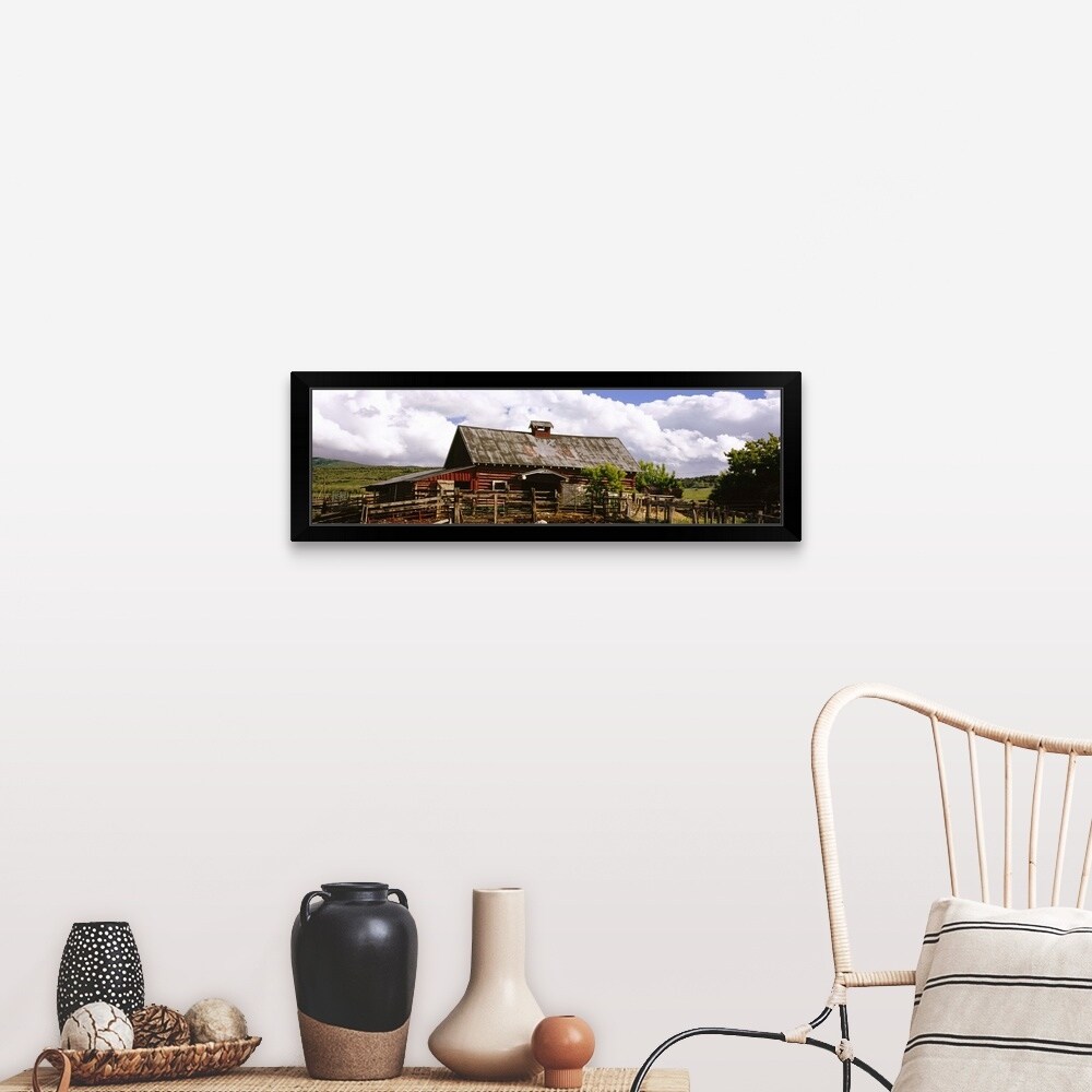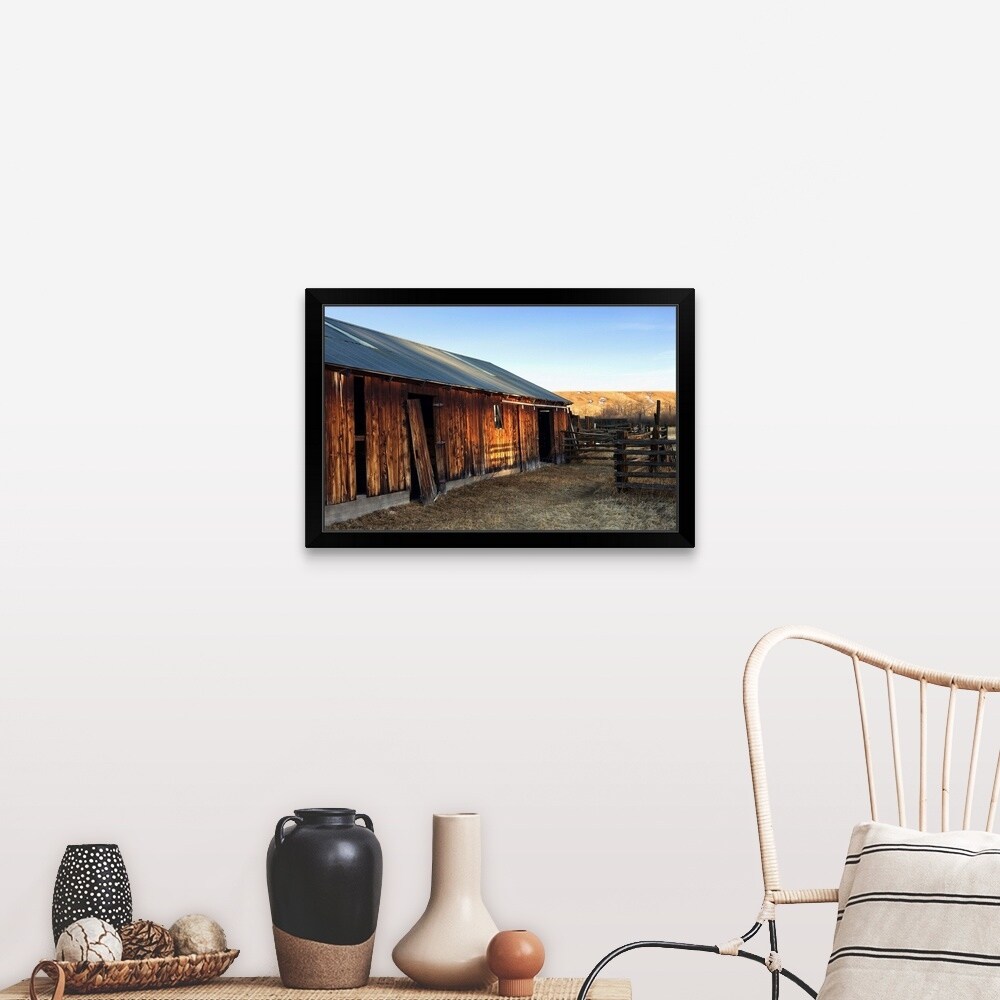 "Fence in front of a barn, historical barn, Collbran, Colorado" Black Framed Print