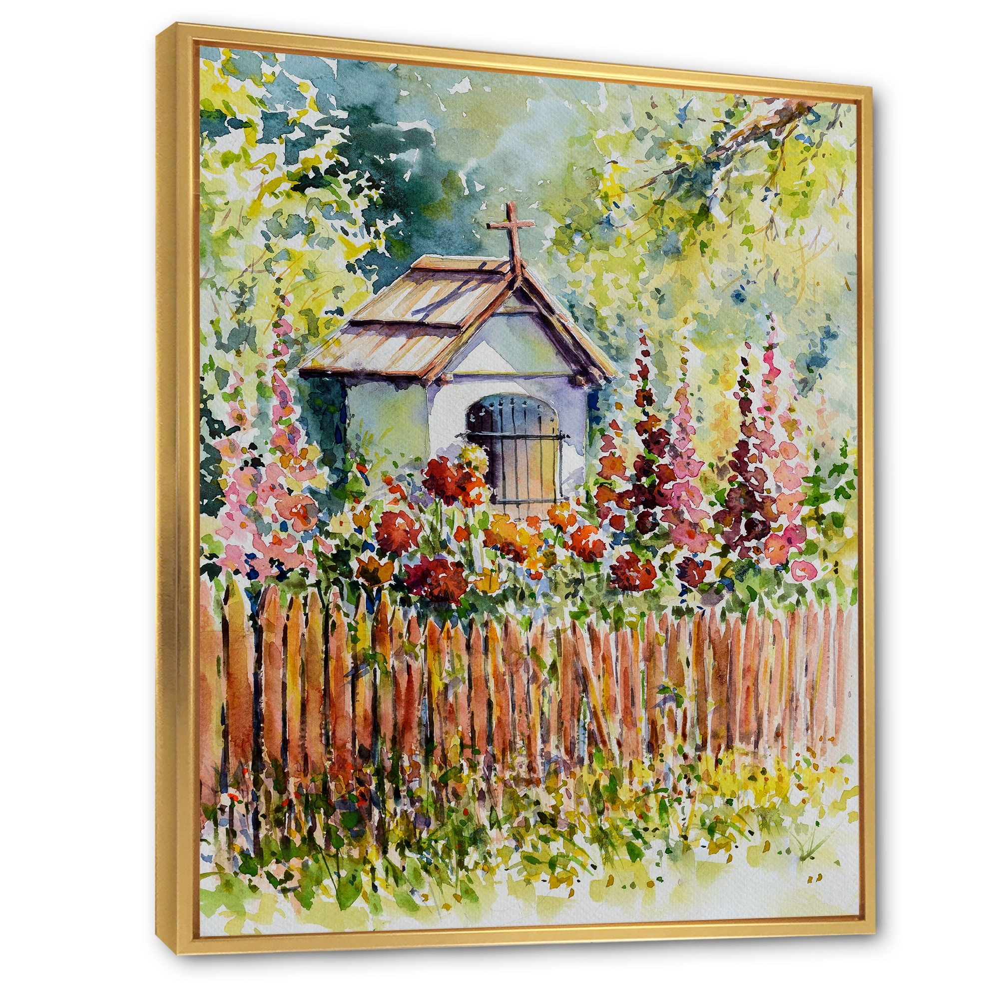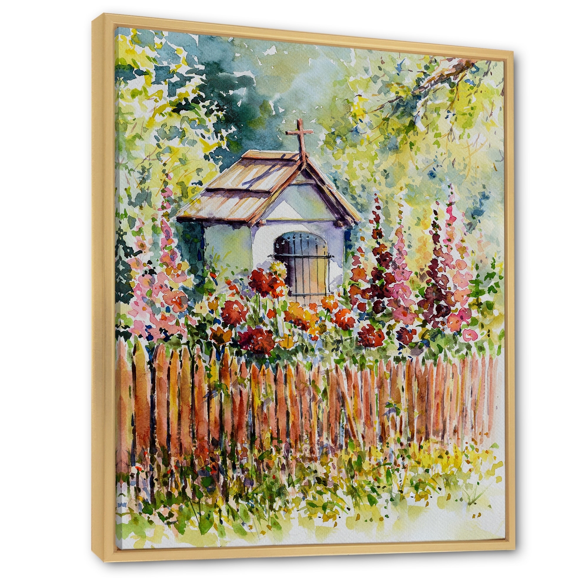 Designart "Small White Chapel Behind the Fence Among Flowers" Cabin & Lodge Framed Canvas Wall Art Print