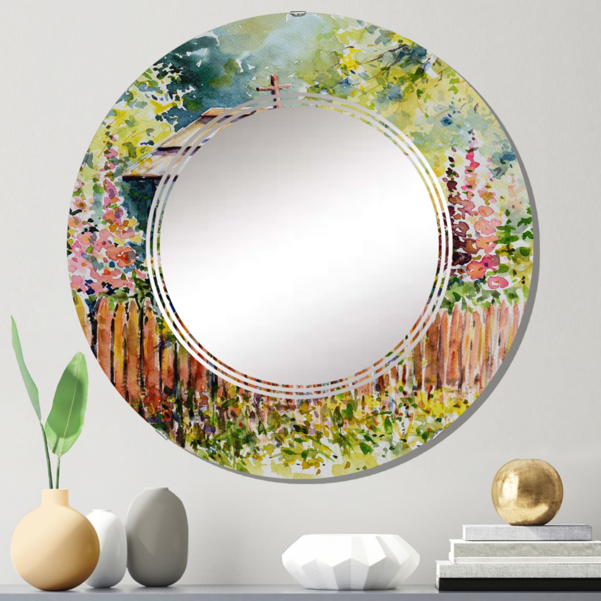 Designart 'Small White Chapel Behind the Fence Among Flowers' Printed Cabin & Lodge Wall Mirror