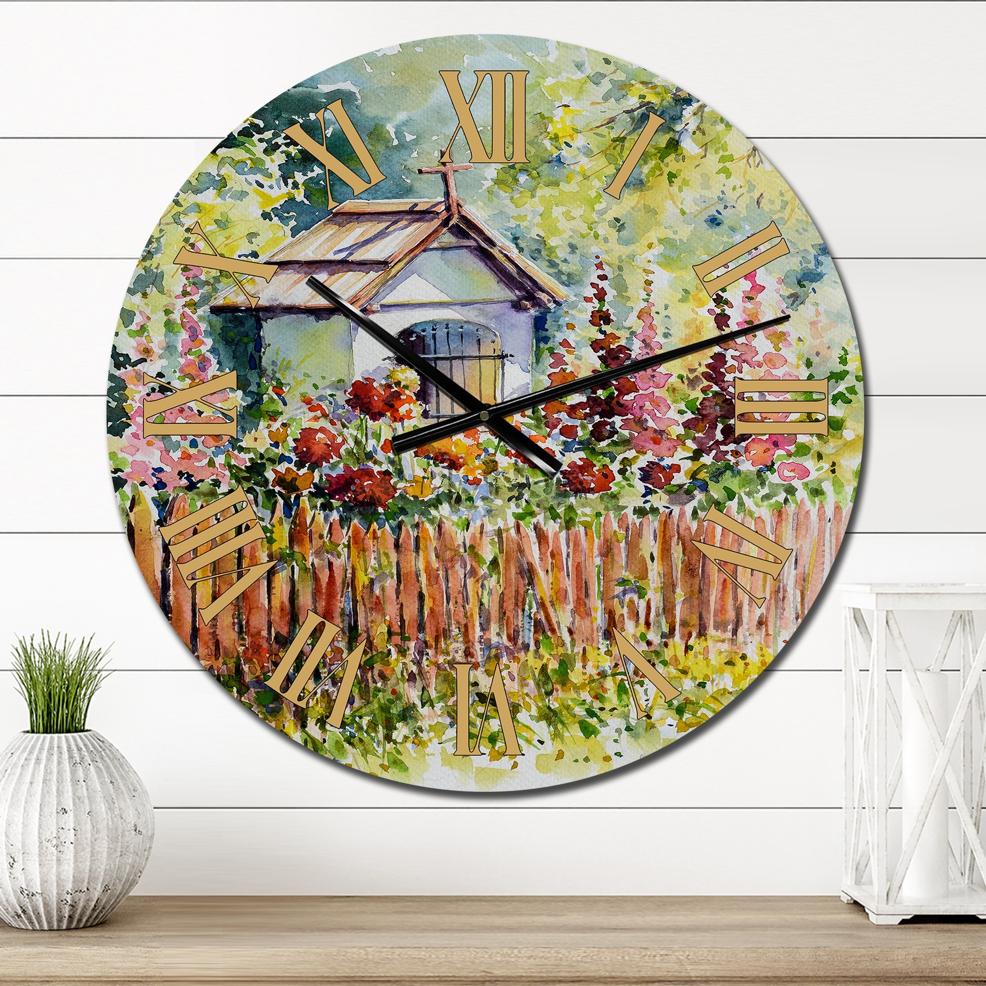 Designart 'Small White Chapel Behind the Fence Among Flowers' Cabin & Lodge wall clock