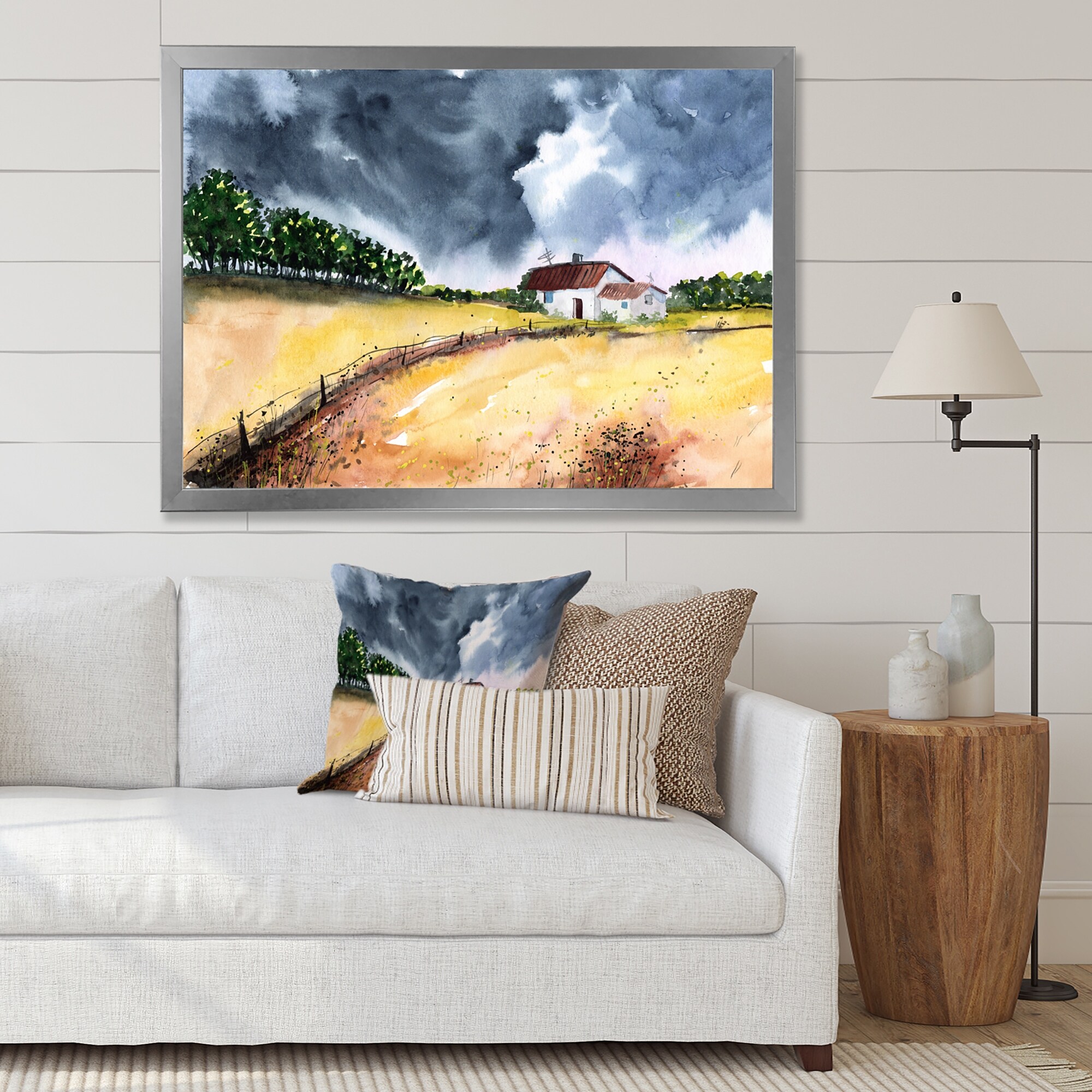 Designart "Yellow Field With Trees A Small Fence, Farmhouses" Country Framed Art Print