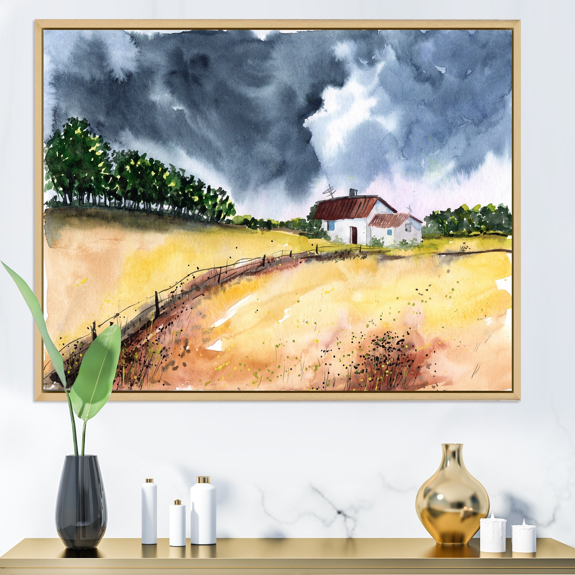 Designart "Yellow Field With Trees A Small Fence, Farmhouses" Country Framed Canvas Wall Art Print
