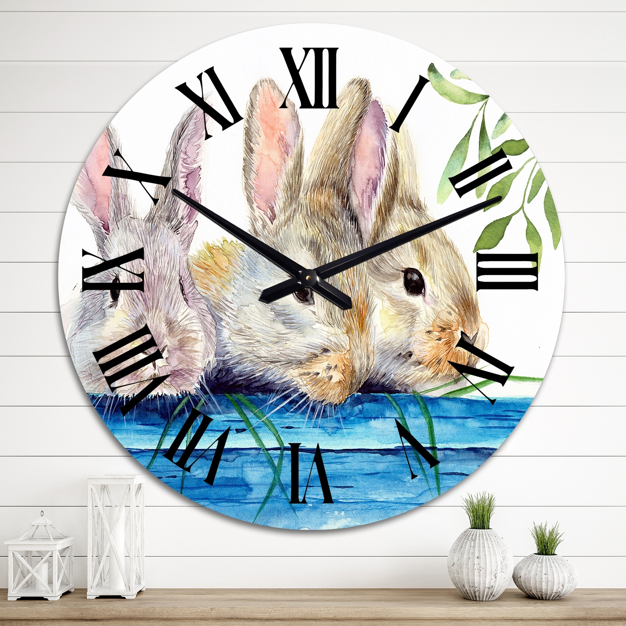 Designart 'Three Fluffy Rabbits Behind A Blue Wooden Fence' Traditional wall clock