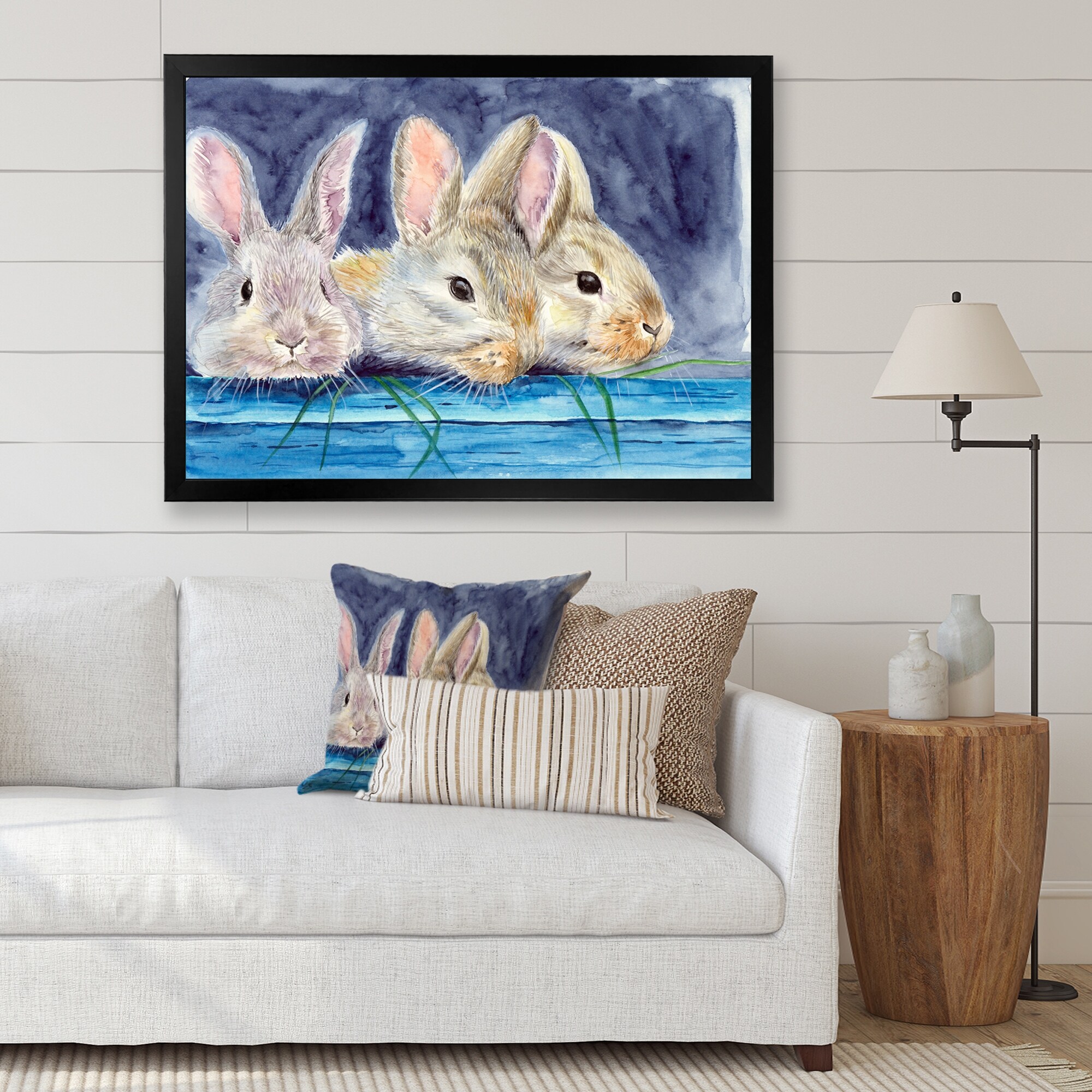 Designart "Three Fluffy Rabbits Behind A Blue Wooden Fence I" Traditional Framed Art Print