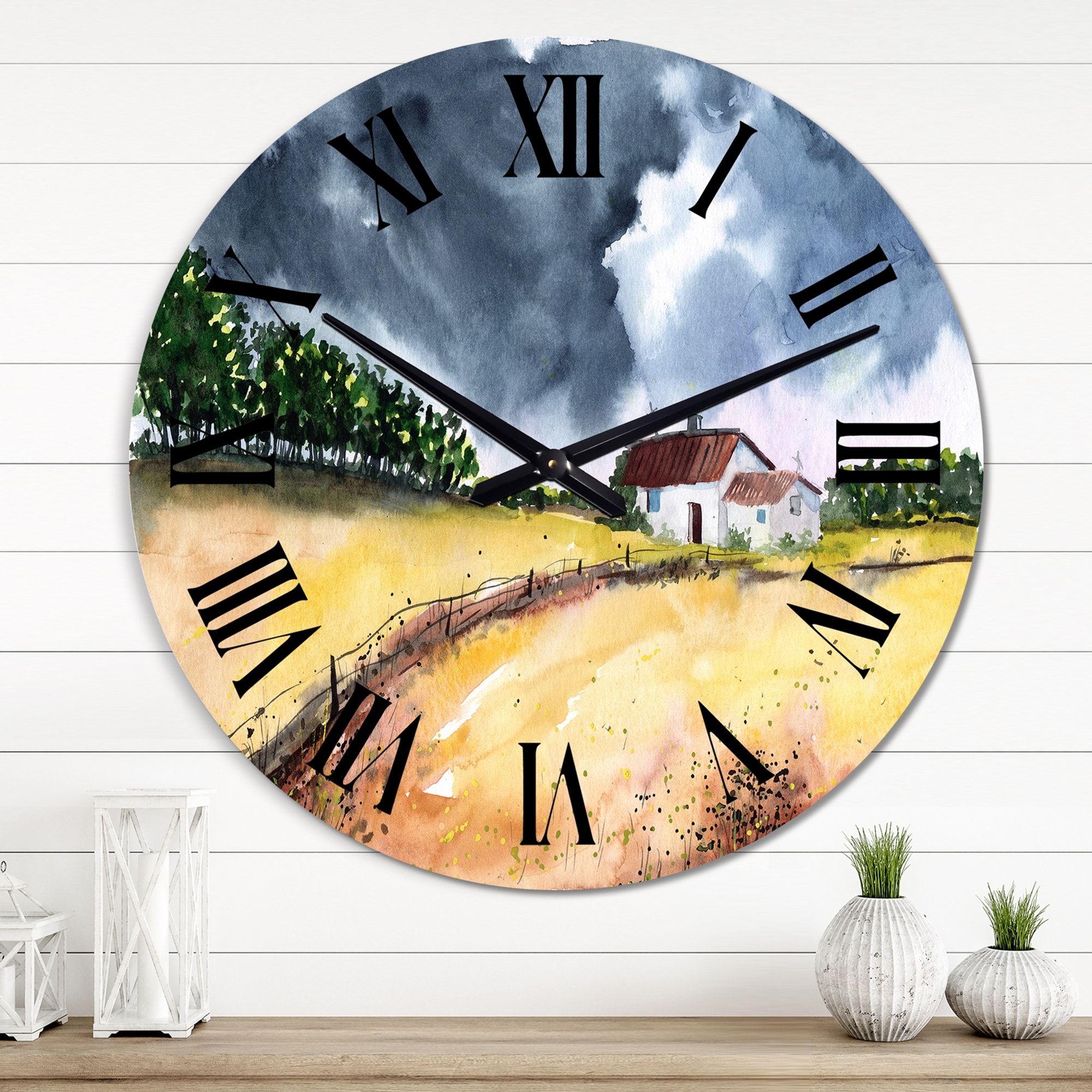 Designart 'Yellow Field With Trees A Small Fence, Farmhouses' Country wall clock