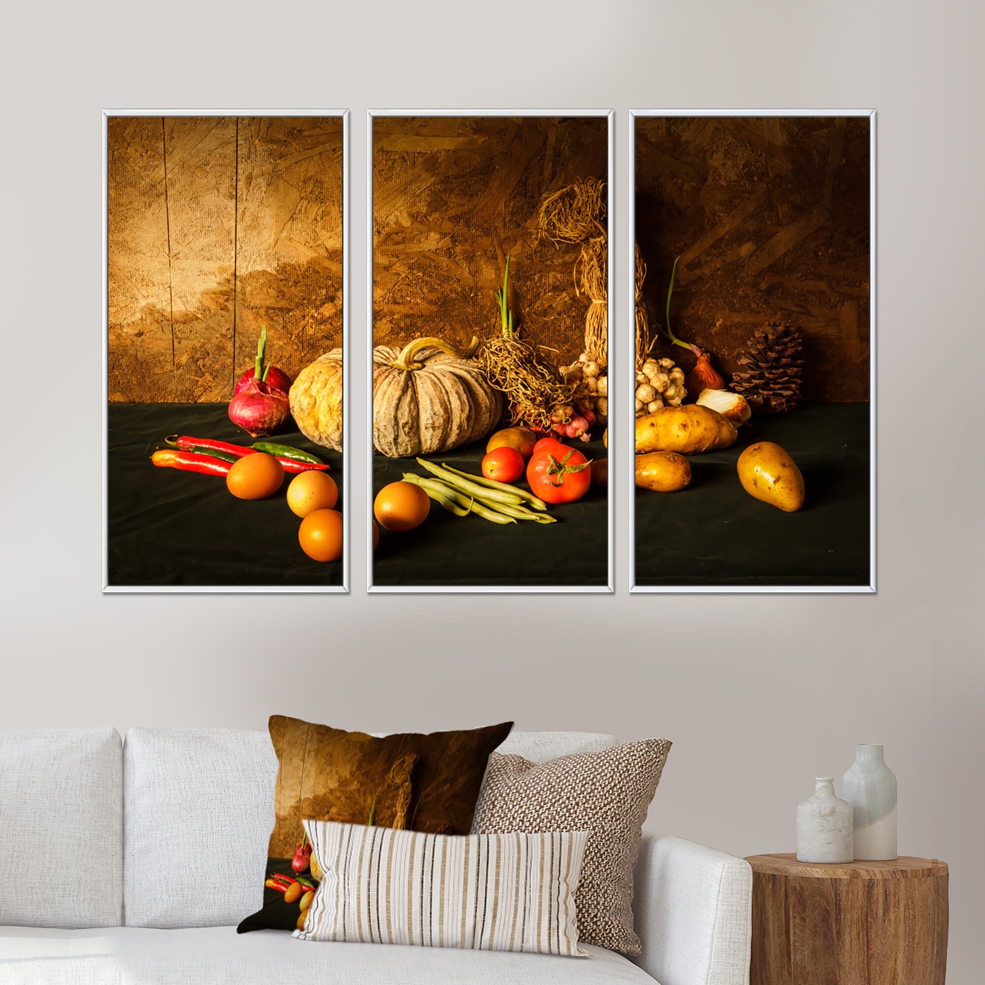 Designart "Vegetables and Fruits in Brown Background" Food Framed Wall Decor Set of 3 - 4 Colors of Frames