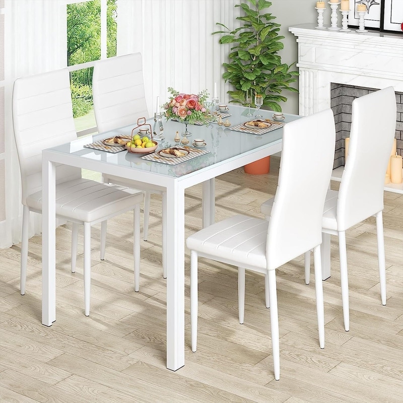 Merax 5 Piece Dining Table Set with Tempered Glass Top Table and 4pcs PU Leather Chair Set