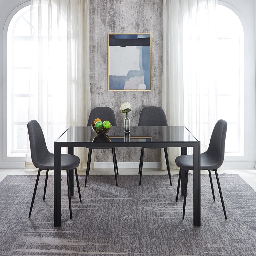 5 Piece Modern Black Glass Dining Set with Fabric Dining Chairs for 4
