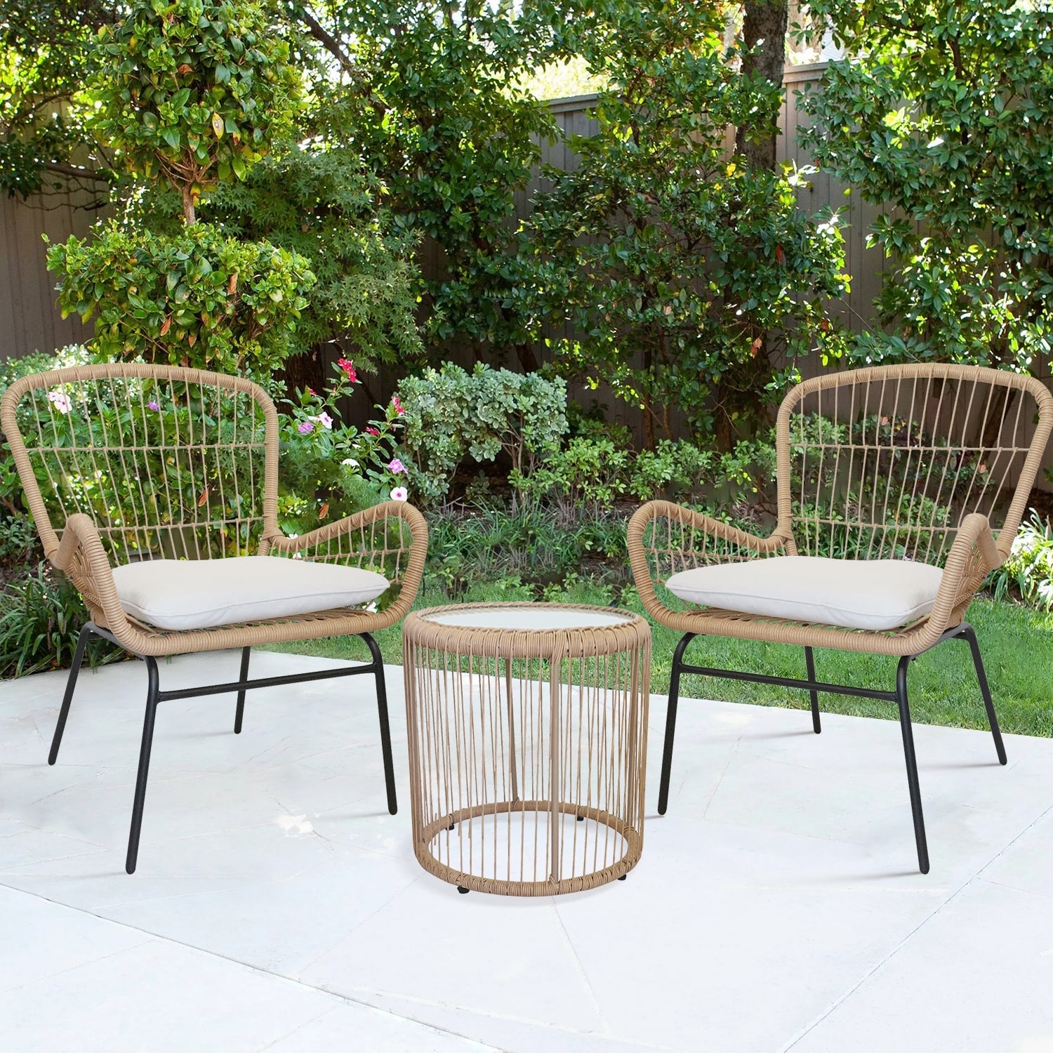 3 Pieces Outdoor Patio Balcony Natural Yellow Wicker Chair Table Set with Beige Cushion and Tempered Glass Table Top