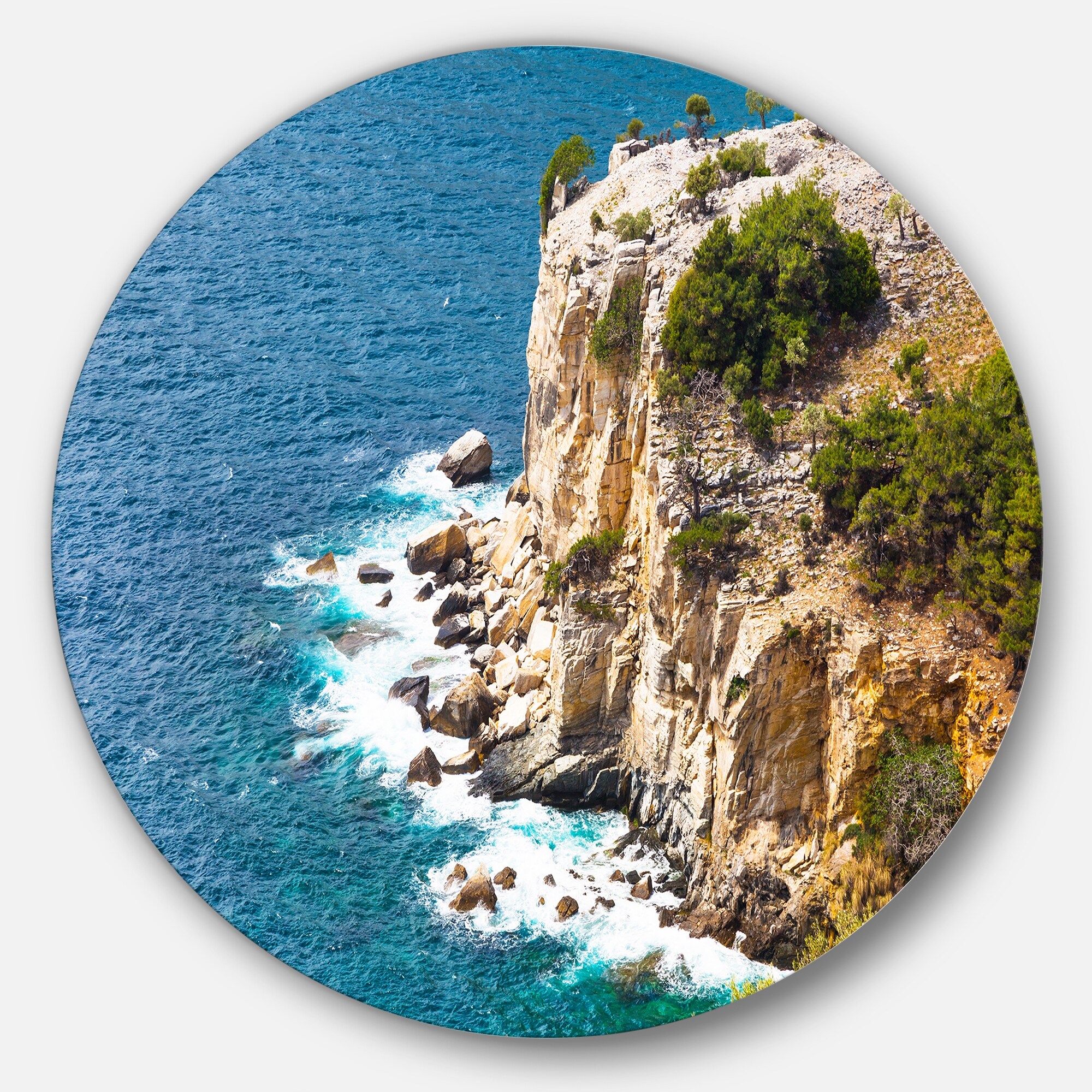 Designart 'Rocky Cliff Coast Thassos Greece' Seashore Round Metal Wall Art