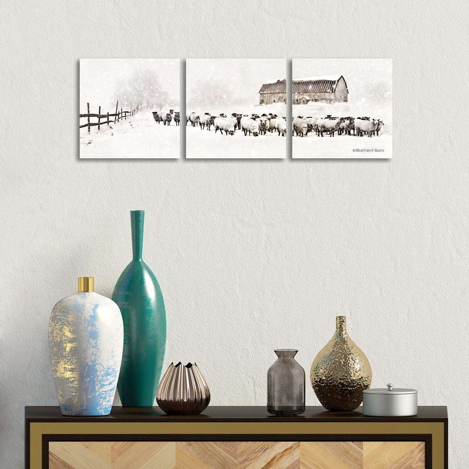 iCanvas "Warm Winter Barn with Sheep Herd" by Bluebird Barn 3-Piece Canvas Wall Art Set