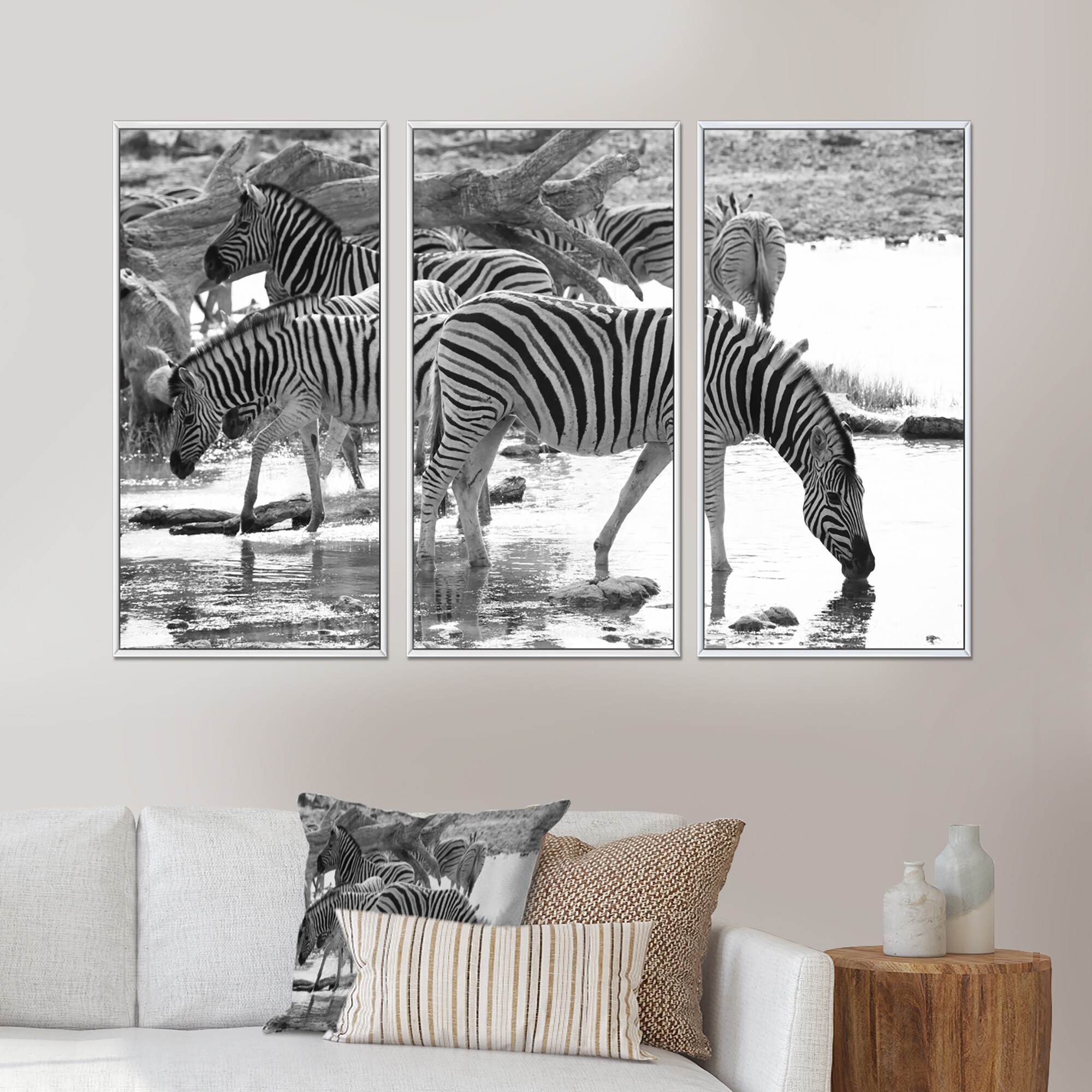 Designart "Herd of Zebra Black and White" Animal Framed Canvas Wall Art Set of 3 - 4 Colors of Frames