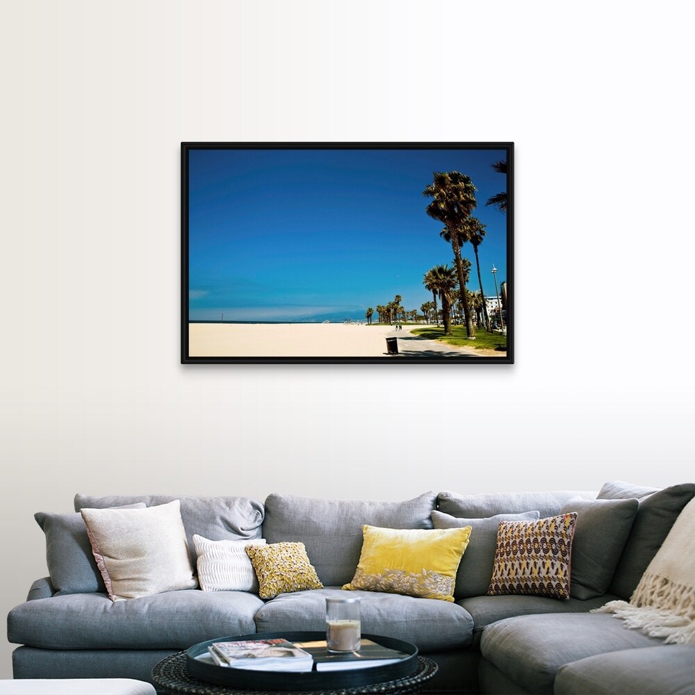 "Palm trees along beach, Venice, California" Black Float Frame Canvas Art