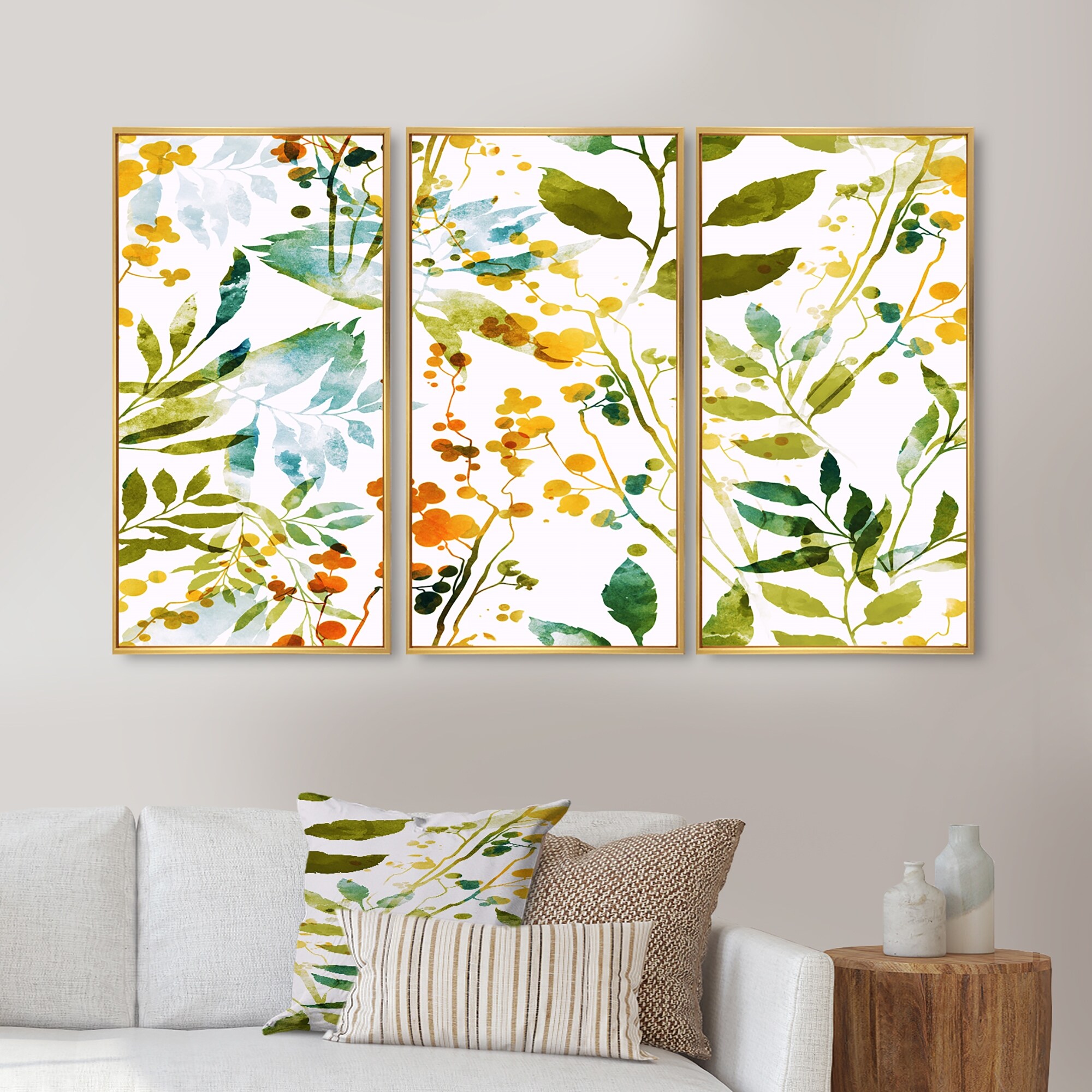 Designart "Spring Herbs Flowers And LeavesOn White" Patterned Framed Canvas Wall Art Print Set of 3 - 4 Colors of Frames