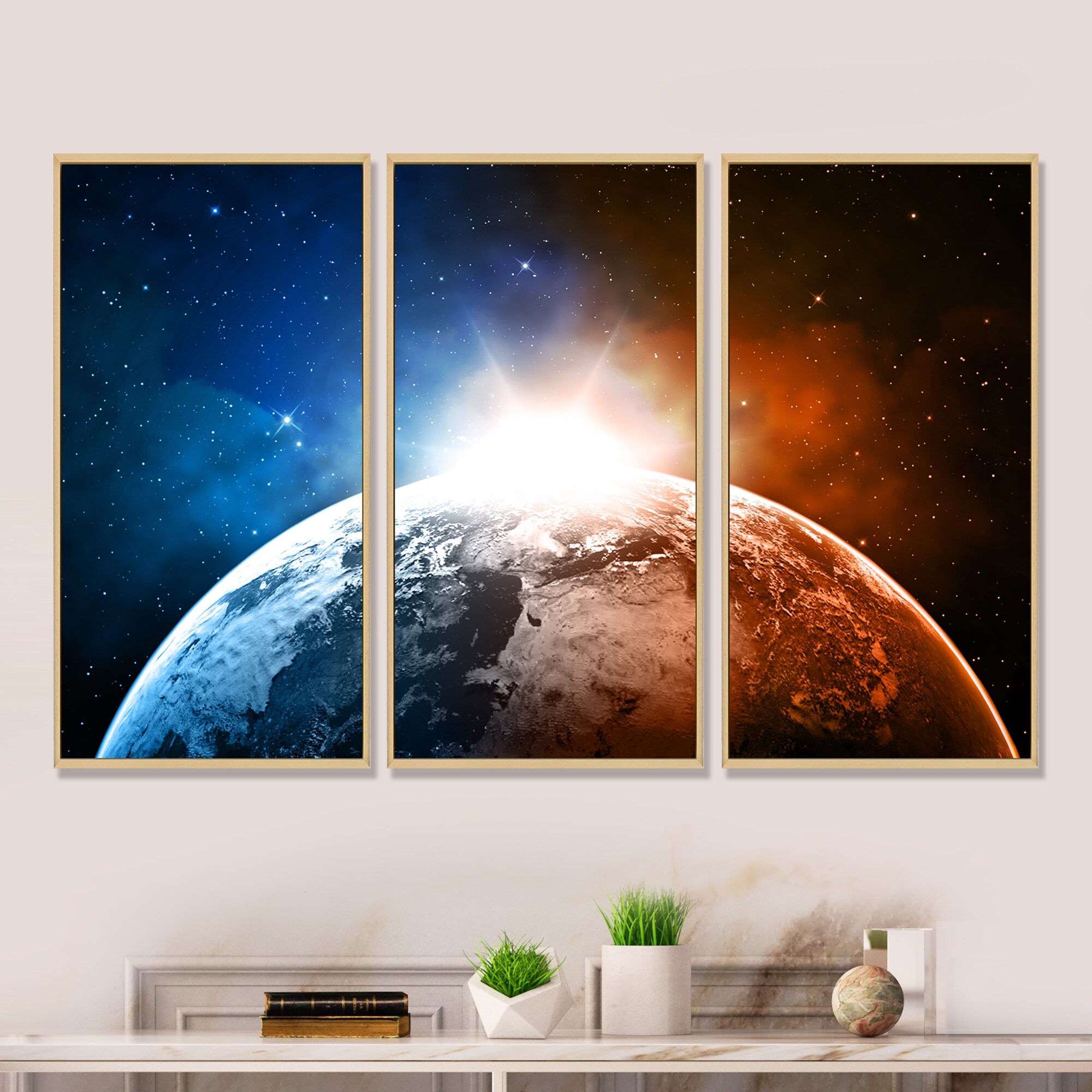 Designart "Planet with Sunrise in Space" Landscape Framed Wall Decor Set of 3 - 4 Colors of Frames