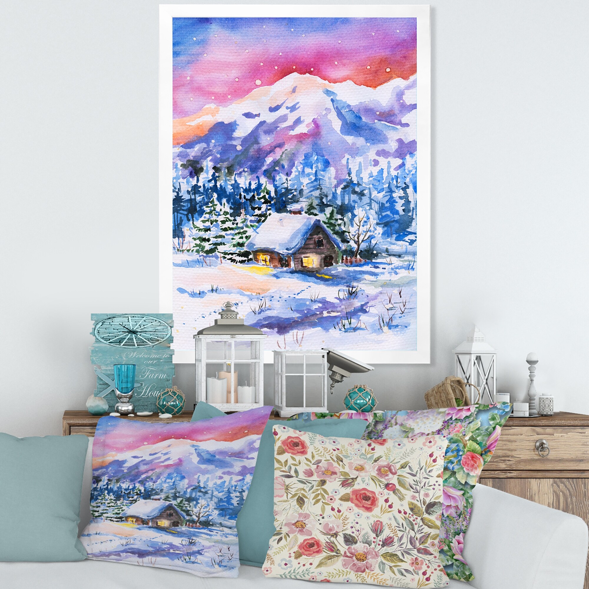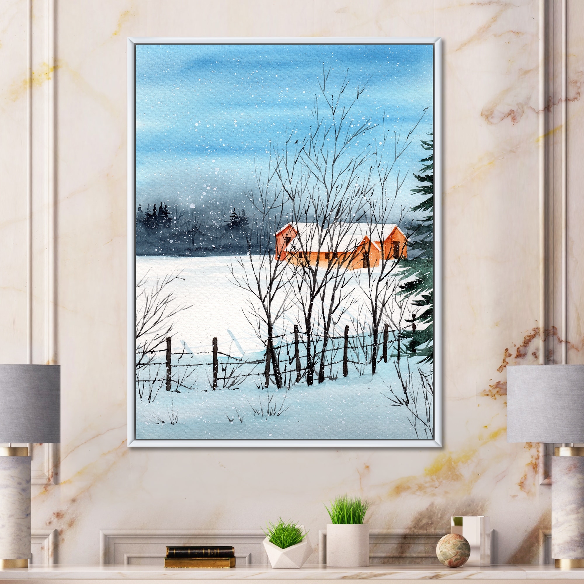 Designart "Little Snowy House in Winter Landscape" Country Framed Art Print