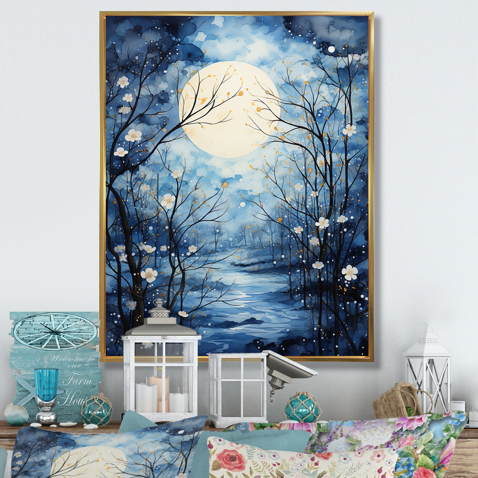 Designart "Blue White Tree Moonlit Silhouette I" Landscape Trees Framed Canvas Prints