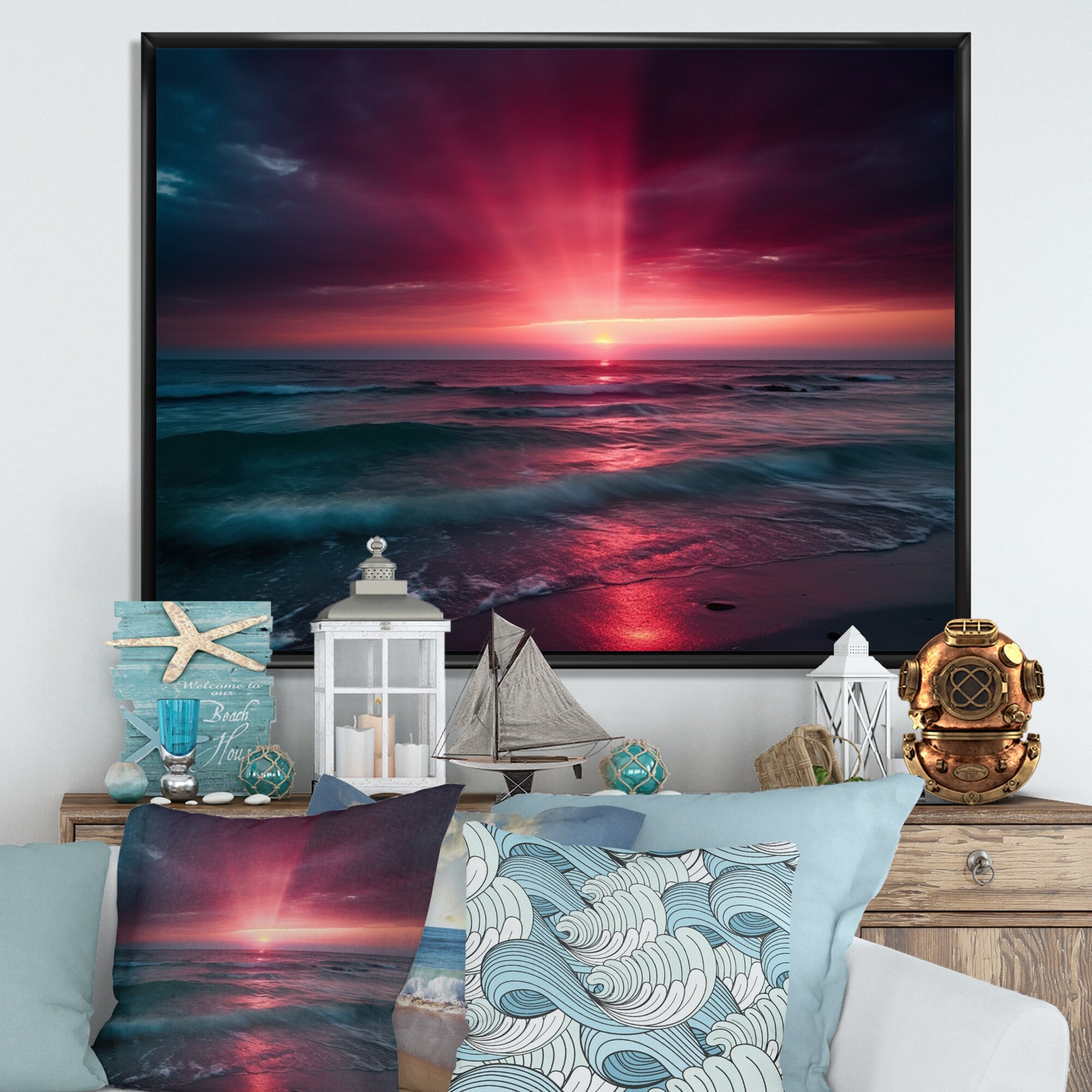 Designart "Pink Coastal Horizon Ii" Modern Landscape Beach Framed Wall Decor