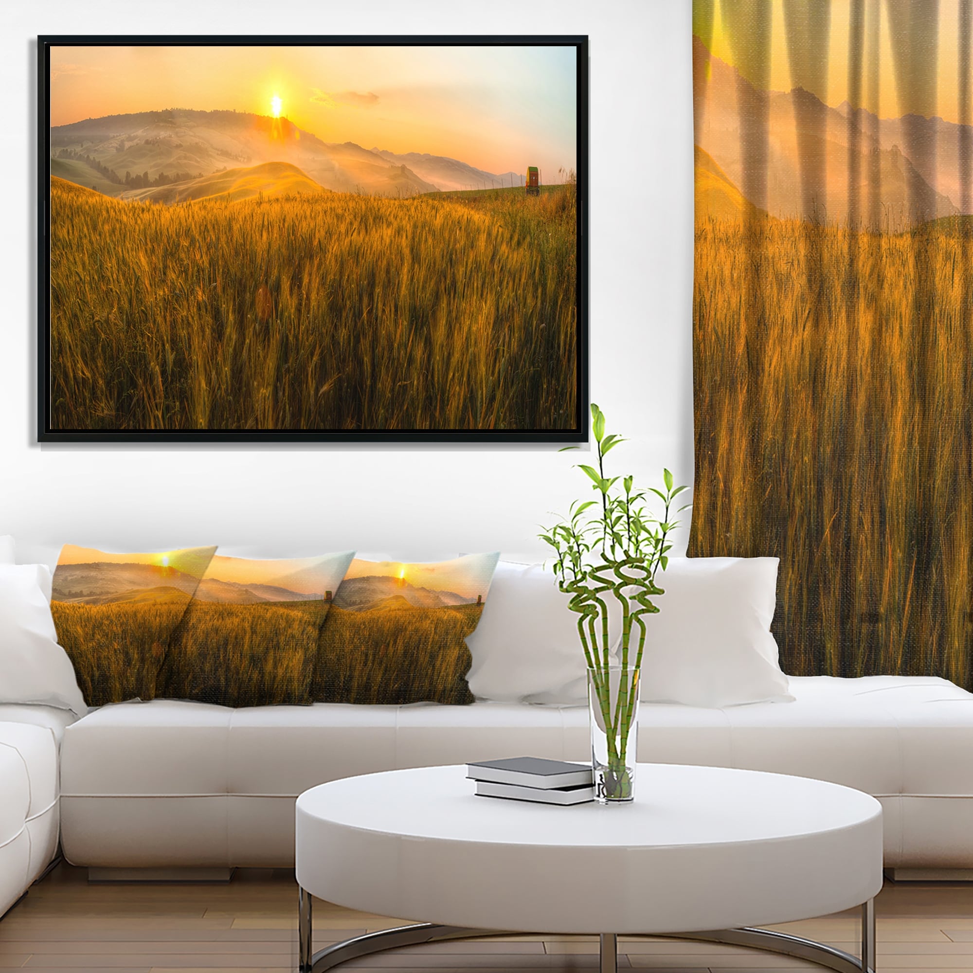 Designart "Tuscany Wheat Field at Sunrise" Landscape Artwork Print on Framed Canvas