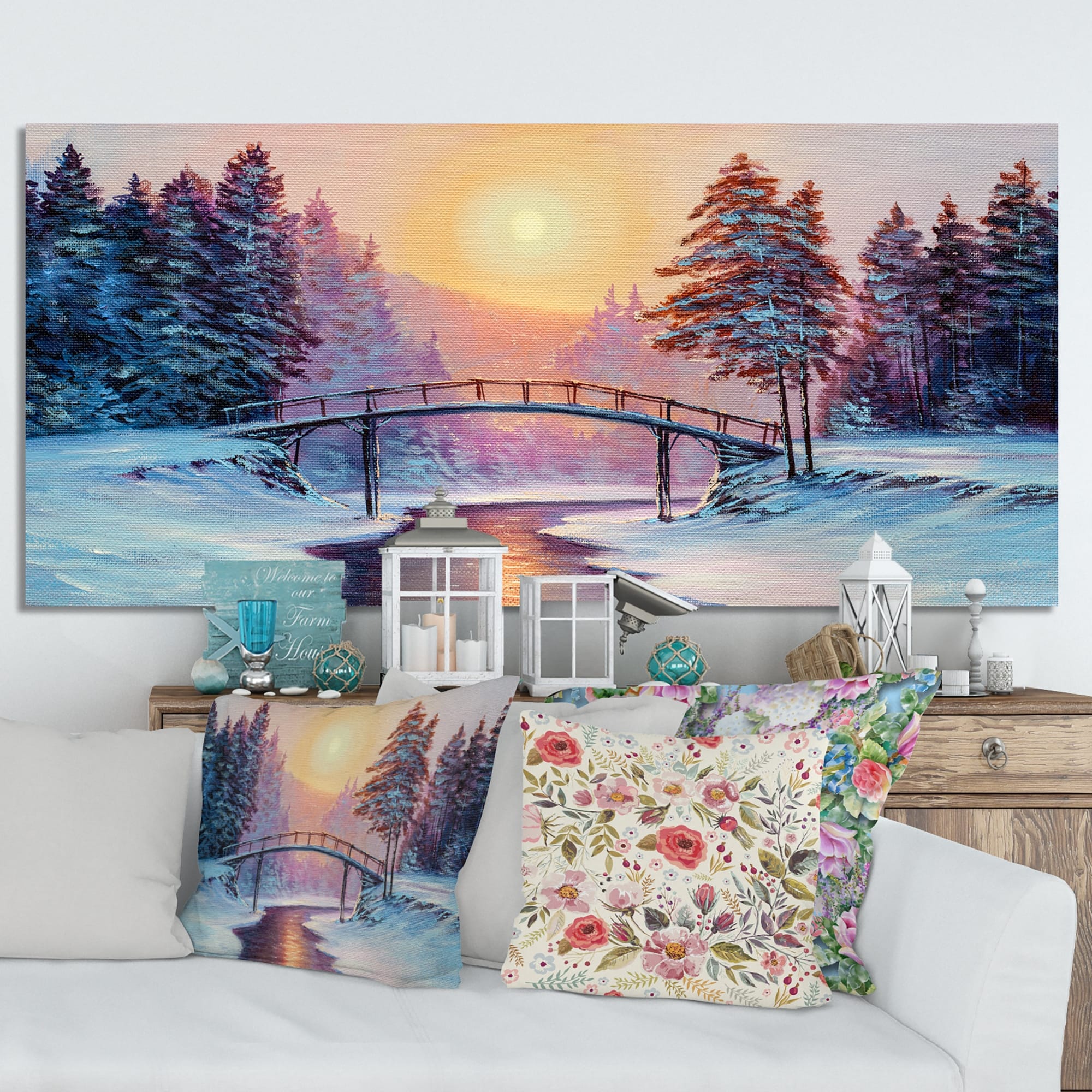 Designart "Sunset On Winter River Bridge Scenery II" Landscapes Canvas artwork