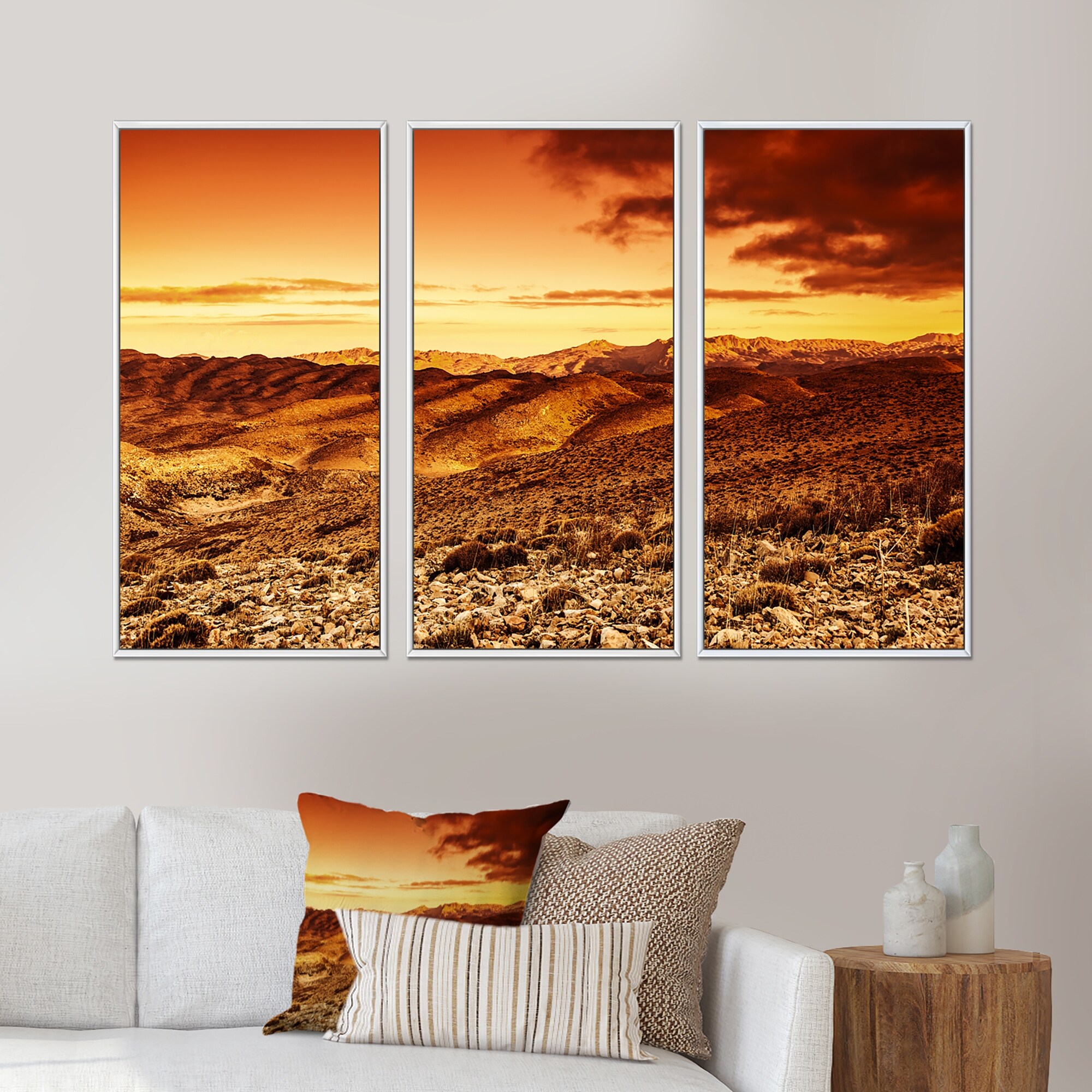 Designart "Cloudy Dramatic Sunset in Desert" Landscape Framed Canvas Wall Art Print Set of 3 - 4 Colors of Frames