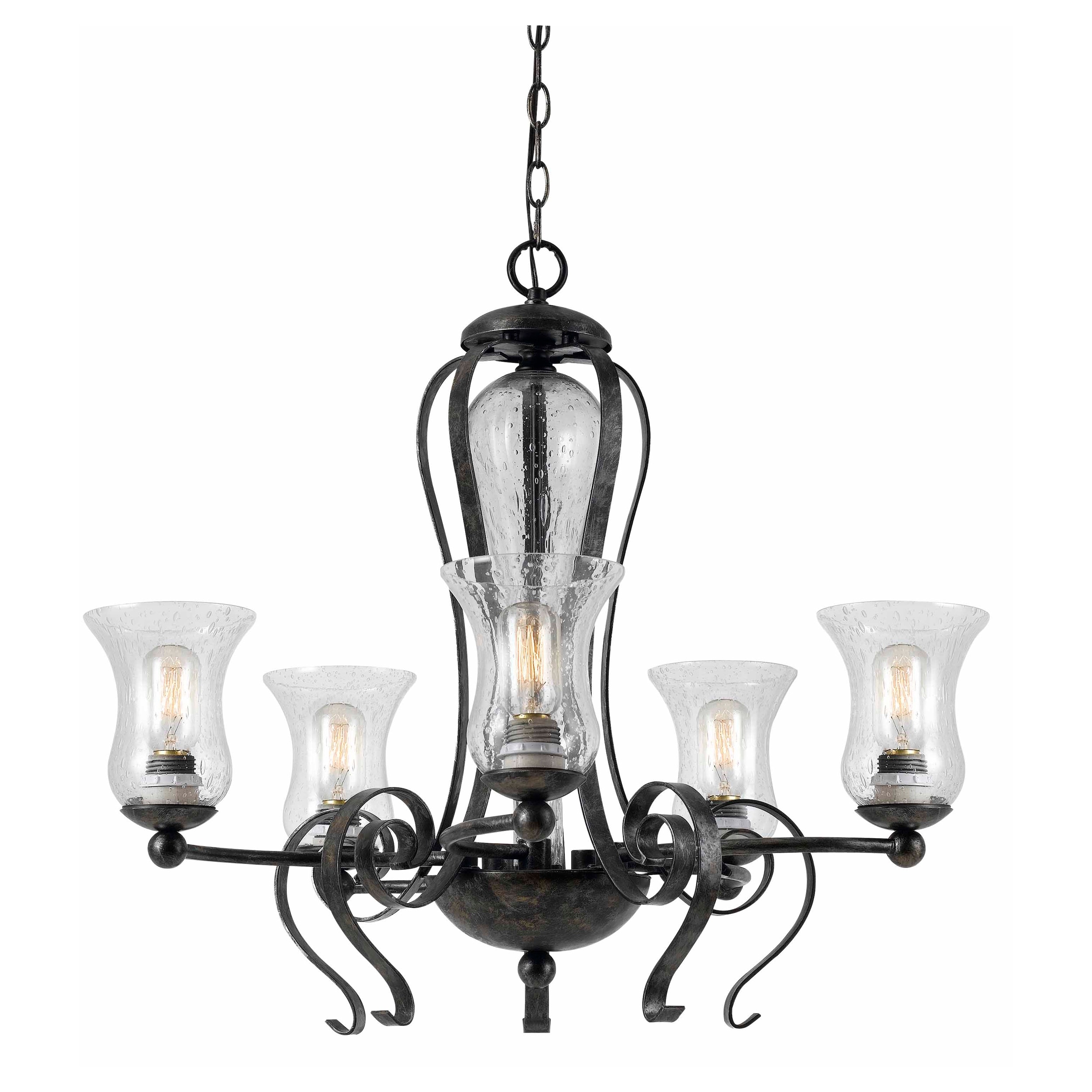 5 Bulb Chandelier with Scrolled Metal Frame and Glass Shades,Gray and Clear