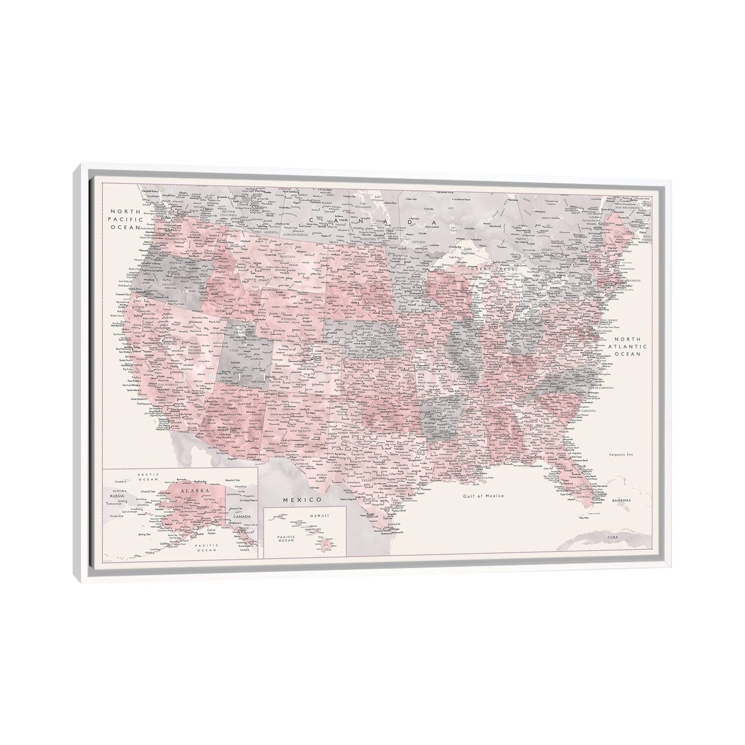iCanvas "Highly Detailed Map of the Usa, Madelia, Cream, Dusty Pink And Grey" by blursbyai Framed Canvas Print