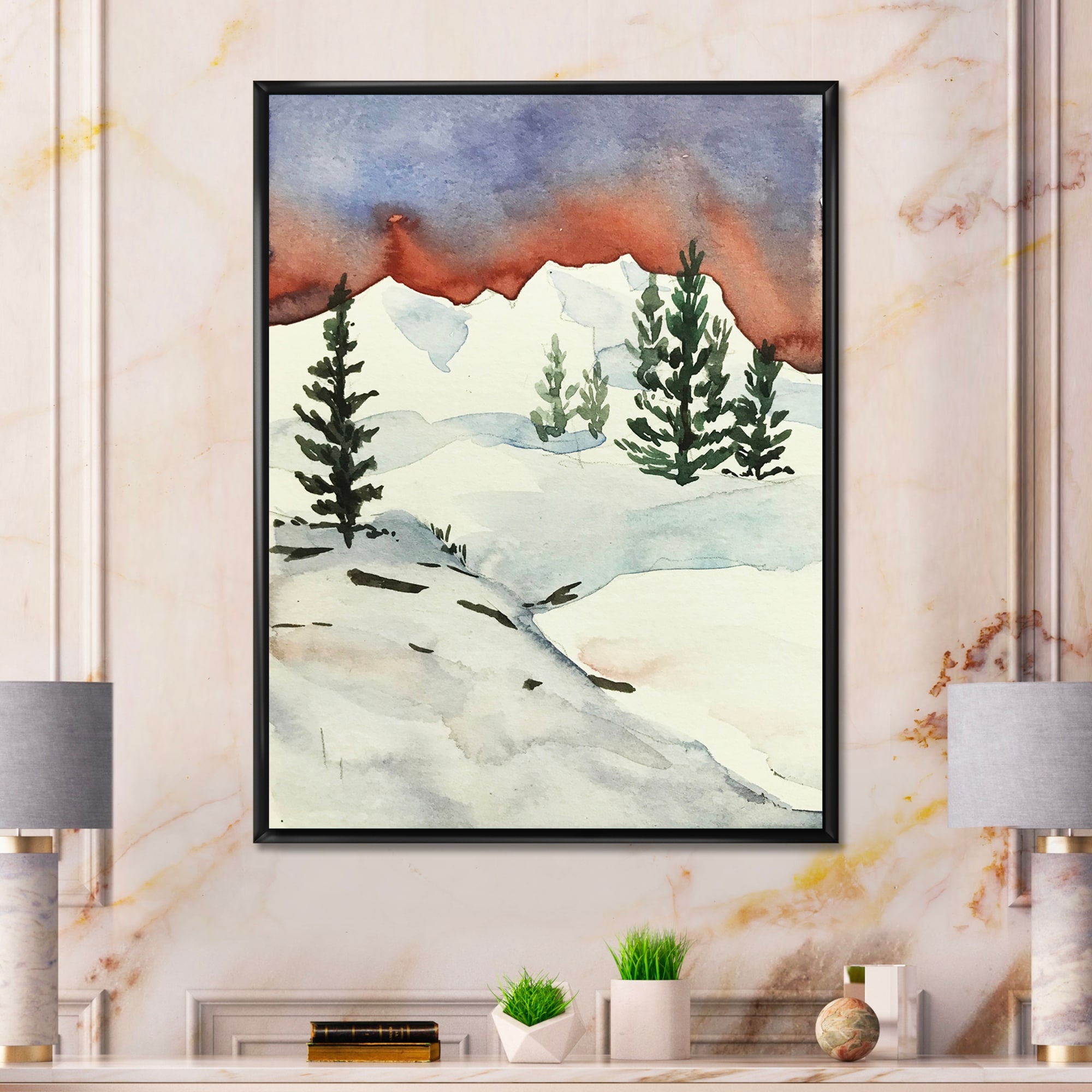 Designart "Fir Trees on Snowy Mountain" Traditional Framed Canvas Wall Art Print