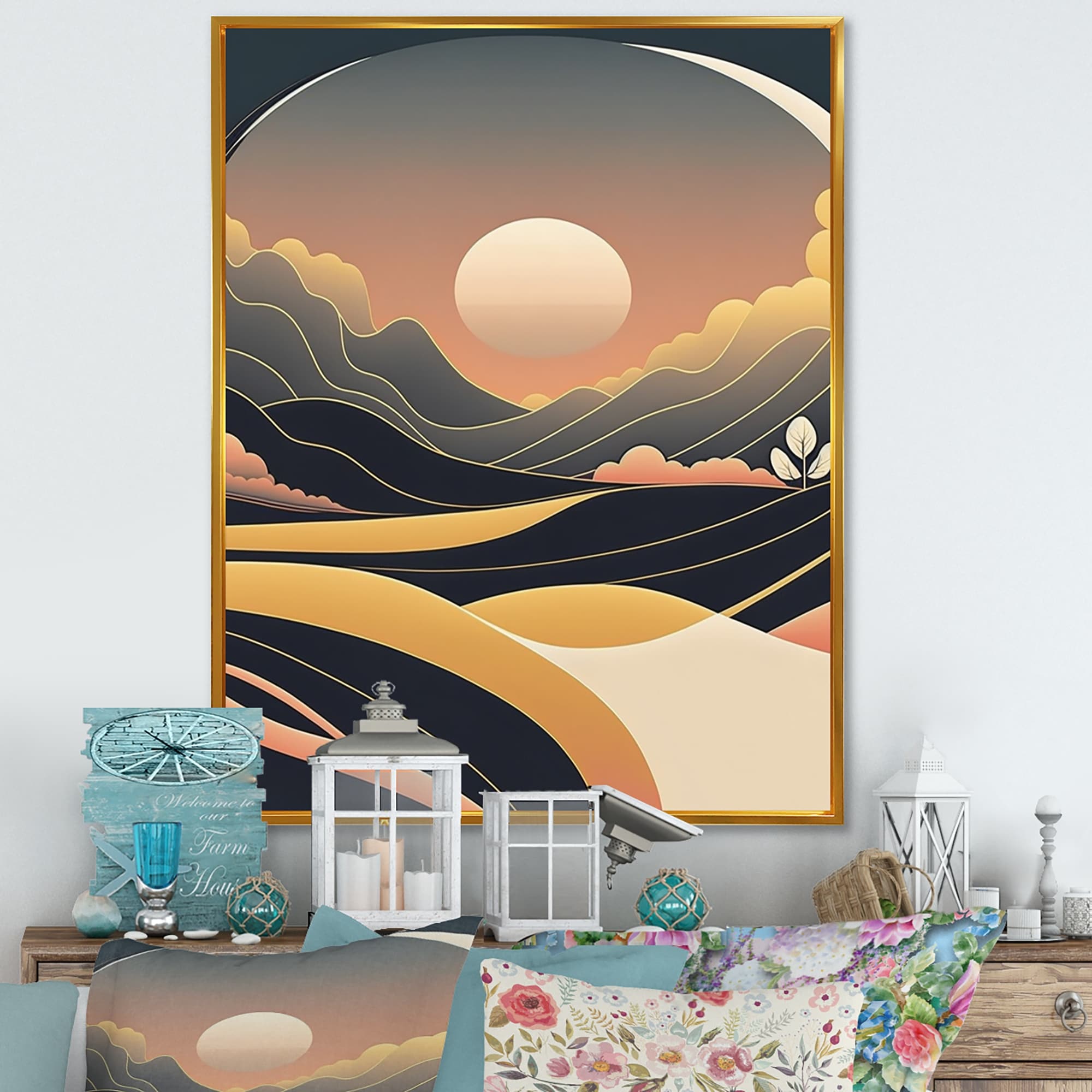 Designart "Landscape With Distant Misty Mountains At Sunset" Country Framed Art Print