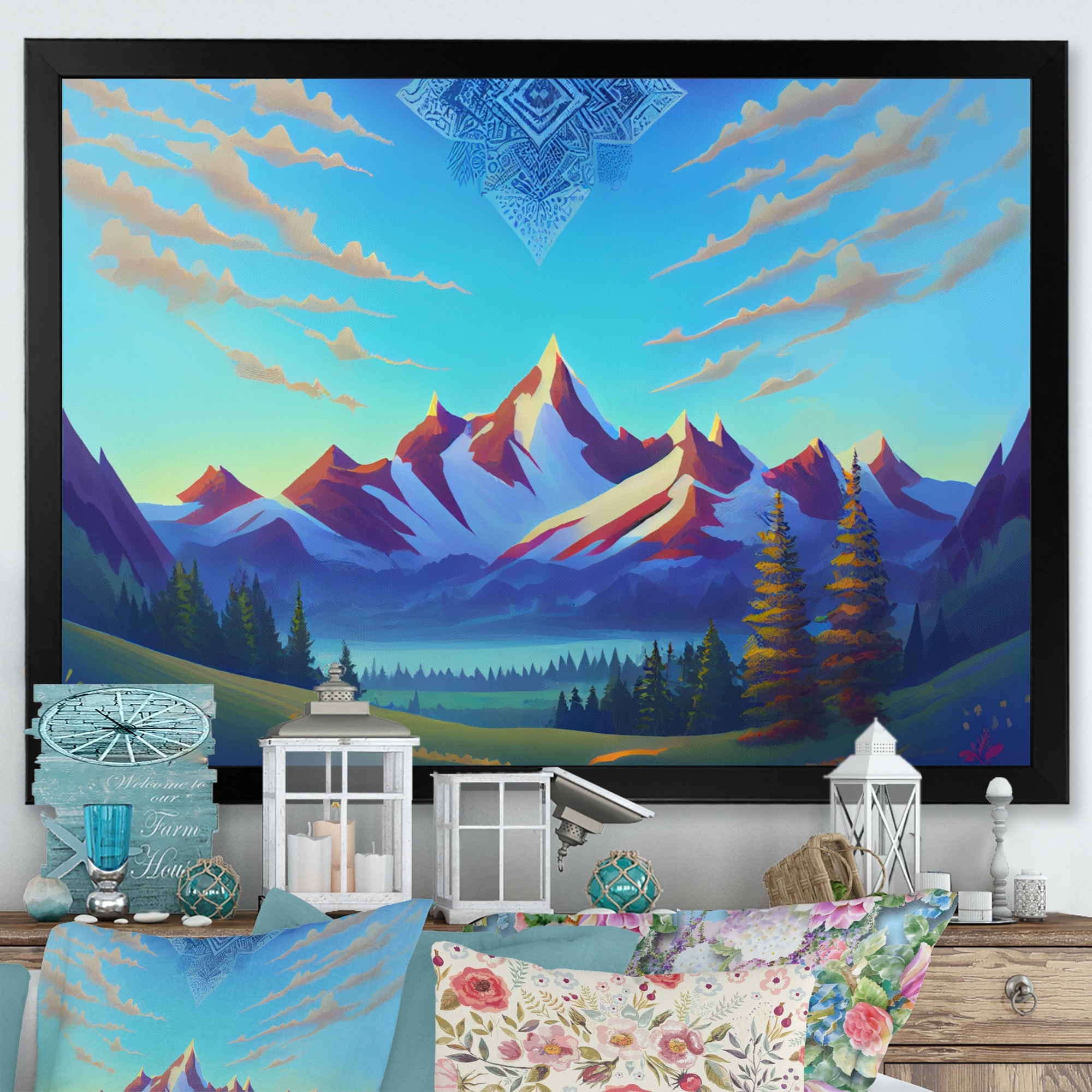 Designart "Mandala In the Sky Above the Valley" Landscape Mountains Framed Art Print
