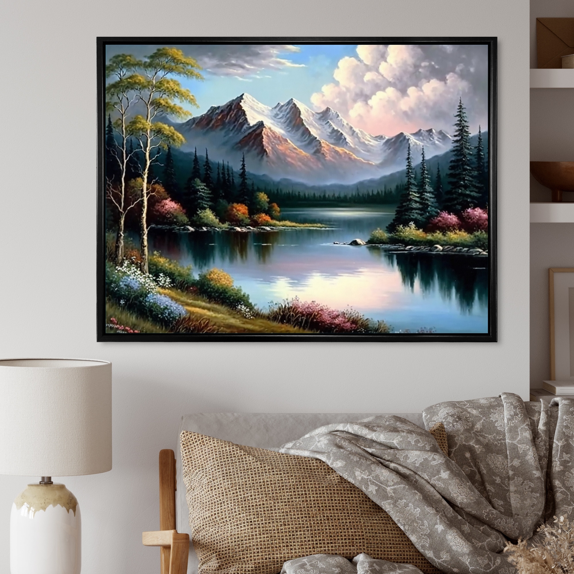 Designart "River Quietude in the Afternoon" Landscape Mountains Framed Canvas Wall Art Print